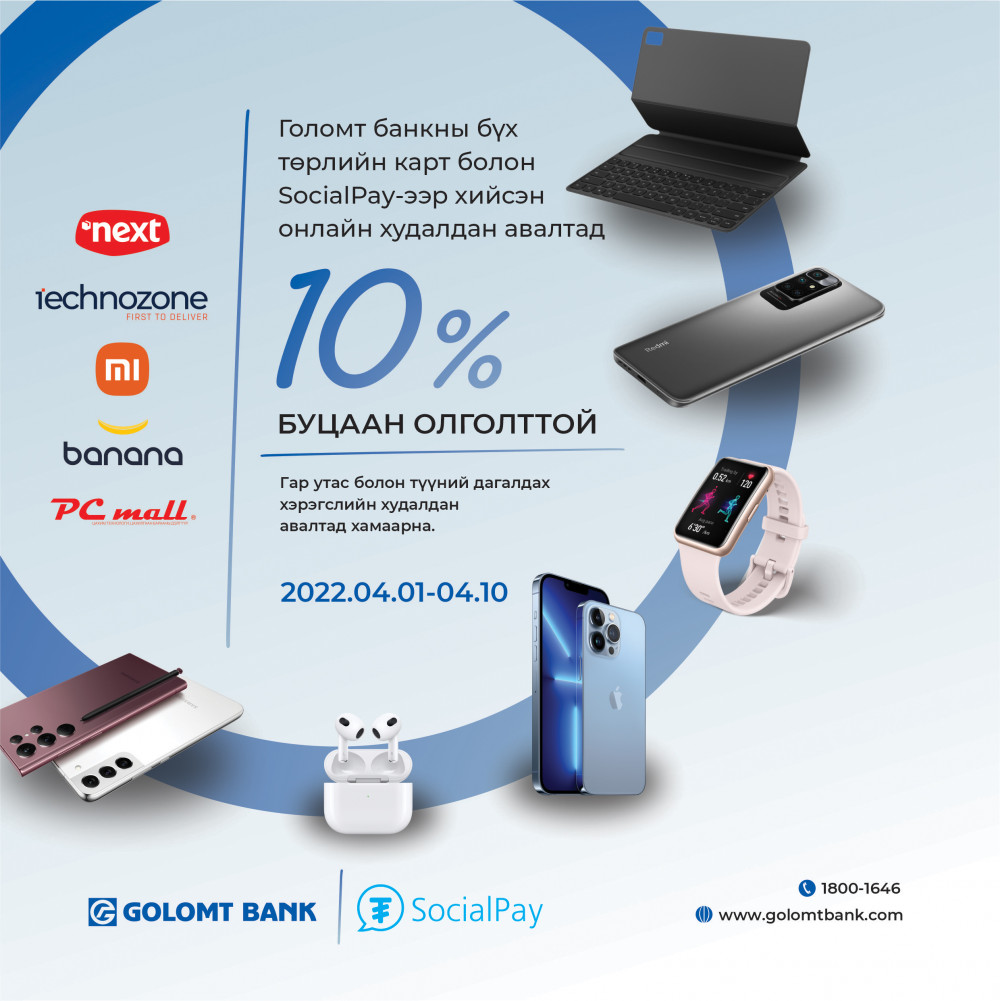 Голомт банк харилцагчдадаа зориулан ээлжит картын урамшууллаа зарлаж байна. Та сонгогдсон онлайн худалдан авалтын вэбсайтуудаас гар утас болон түүний дагалдах хэрэгсэл худалдан аваад 10% буцаан олголт аваарай. Харин төлбөрөө заавал Голомт банкны картаар эсвэл SocialPay аппликэйшн ашиглан хийсэн байх шаардлагатайг анхаарна уу.