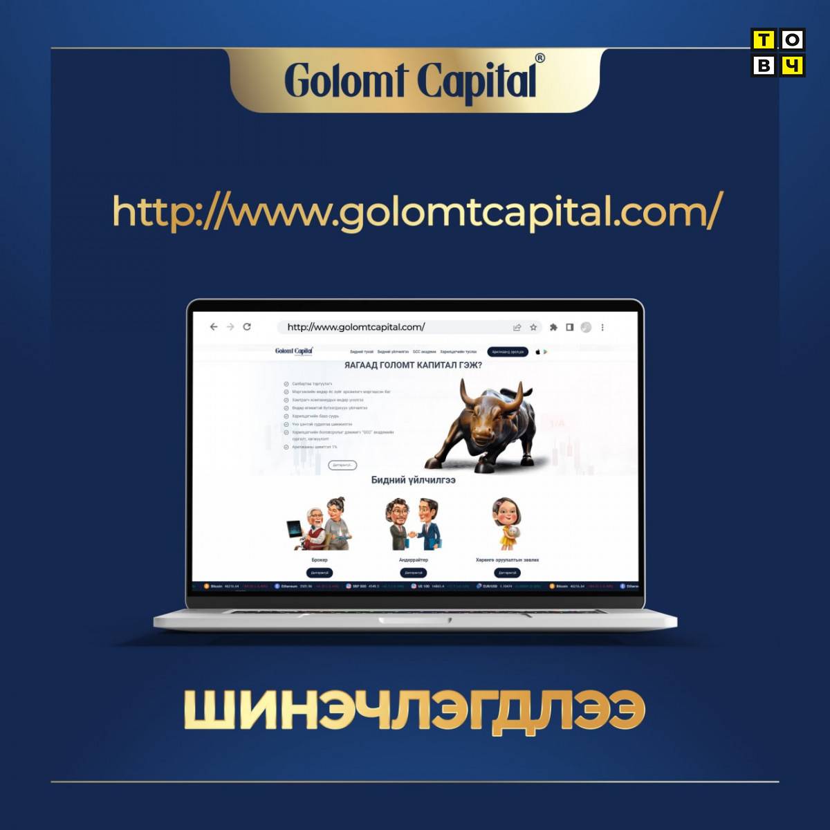 Монголын хөрөнгийн зах зээлд шинэ соёлыг түгээхээр зорин ажиллаж буй Голомт Капитал ҮЦК ХХК-ийн хамт олон хөрөнгийн зах зээлд харилцагчдадаа замчлах зорилгоор www.golomtcapital.com сайтаа шинэчилж, ашиглалтад орууллаа.