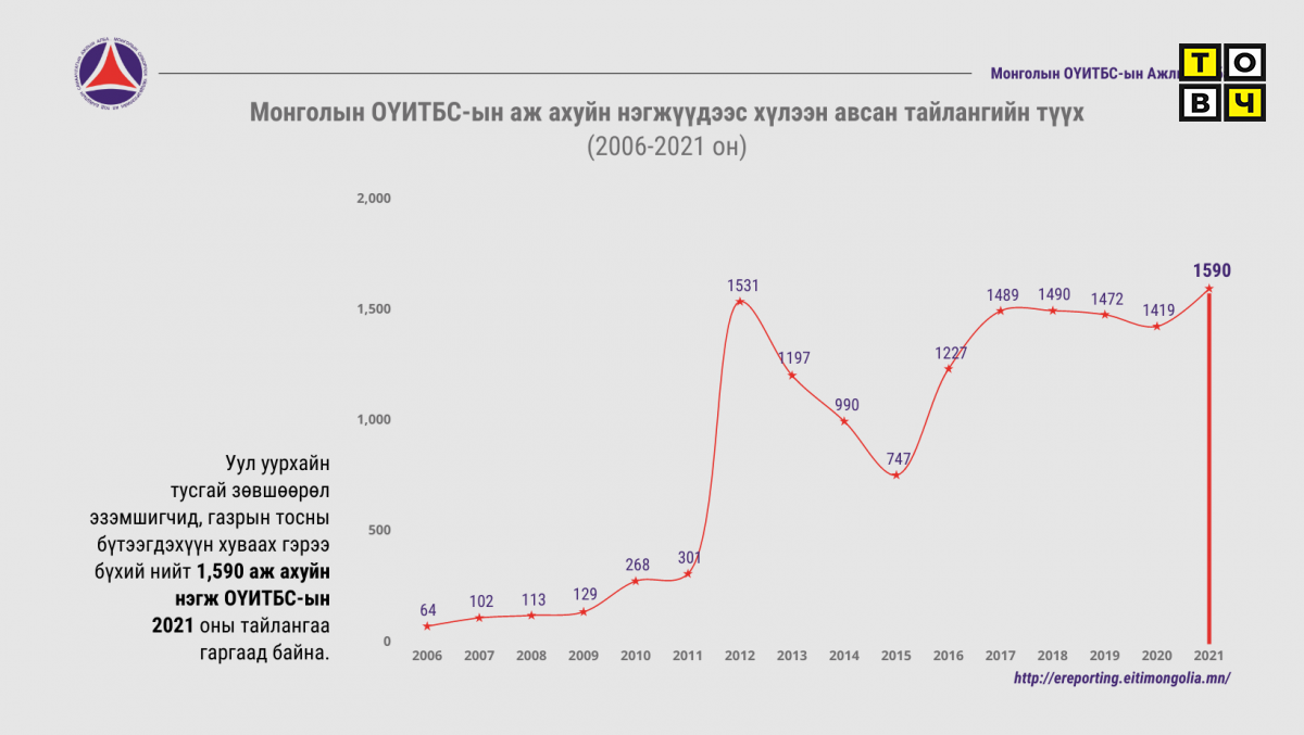 Уул уурхайн тусгай зөвшөөрөл эзэмшигч, газрын тосны бүтээгдэхүүн хуваах гэрээтэй аж ахуйн нэгжүүдээс 1590 нь 2021 оны ОҮИТБС-ын тайлангаа гаргасан нь тус санаачилга Монгол Улсад хэрэгжиж буй 17 жилийн түүхэнд хамгийн өндөр үзүүлэлт боллоо.