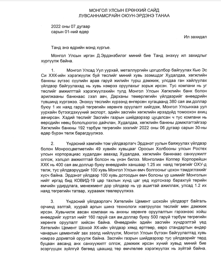 ХХБ-ны ТУЗ-ийн дарга Д.Эрдэнэбилэг Ерөнхий сайдад захидал бичжээ. Тус захидлыг хүргэж байна.