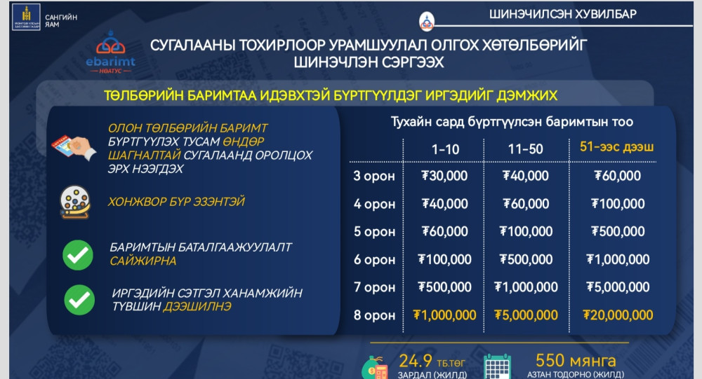 - Тухайлбал өмнө нь бид Боловсрол суваг телевизээр сугалааны тохирлыг шууд дамжуулж байсан бол ирэх сараас Номин, И-март зэрэг томоохон худалдааны төвүүдэд олон нийтийн хяналт дор явуулна. Мөн хэдий чинээ олон баримт уншуулна, тэр хэрээр сугалаанд хожих магадлал өснө. Манай иргэд сард дунджаар 17-20 баримт баталгаажуулдаг. Хэрэв 10 хүртэлх сугалаа бүртгүүлсэн хүн 3 орон таарвал 30 мянган төгрөг хожих бол 50 хүртэлх баримт уншуулсан хүн 40 мянга, 50 дээш баримт бүртгүүлсэн хүн 60 мянган төгрөг хожих жишээний.