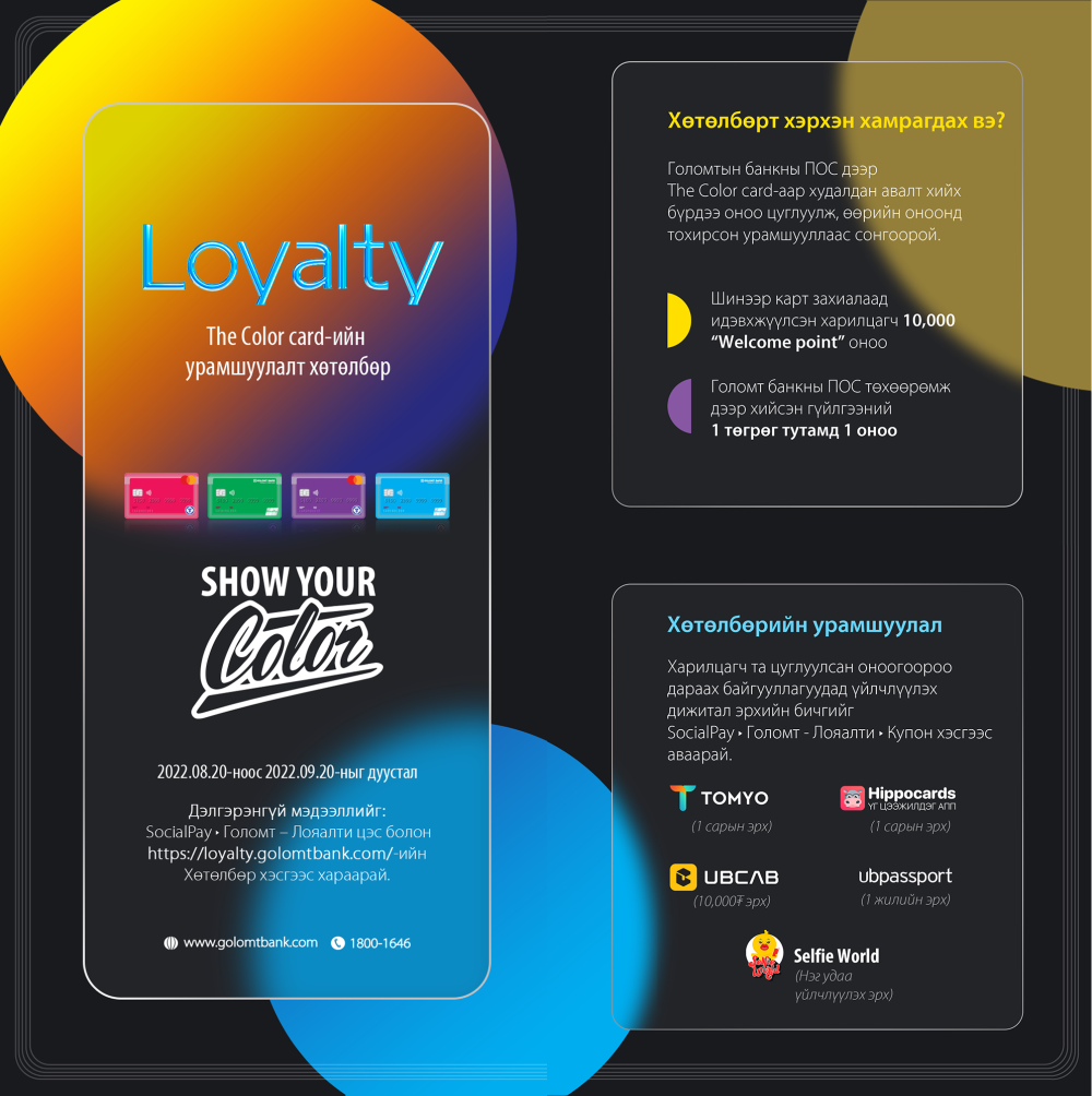 Зуны амралт дуусахад хэдхэн хоног үлдлээ. Хичээл эхлэхээс өмнө амжиж зуныг мэдэрч, цагийг хөгжилтэй өнгөрөөмөөр байна уу? Тэгвэл The Color Card харилцагчдадаа зориулан “Loyalty” оноо цуглуулах урамшуулалт хөтөлбөрийг зарлаж байна. Та Голомт банкны ПОС төхөөрөмж дээр The Color Card-аараа төлбөр тооцоо хийгээд гүйлгээний 1₮ тутамд 1 оноо цуглуулаарай. Ингэснээр та цуглуулсан оноогоо ашиглан дараах БЭЛГҮҮДЭЭС сонгон авах боломжтой.