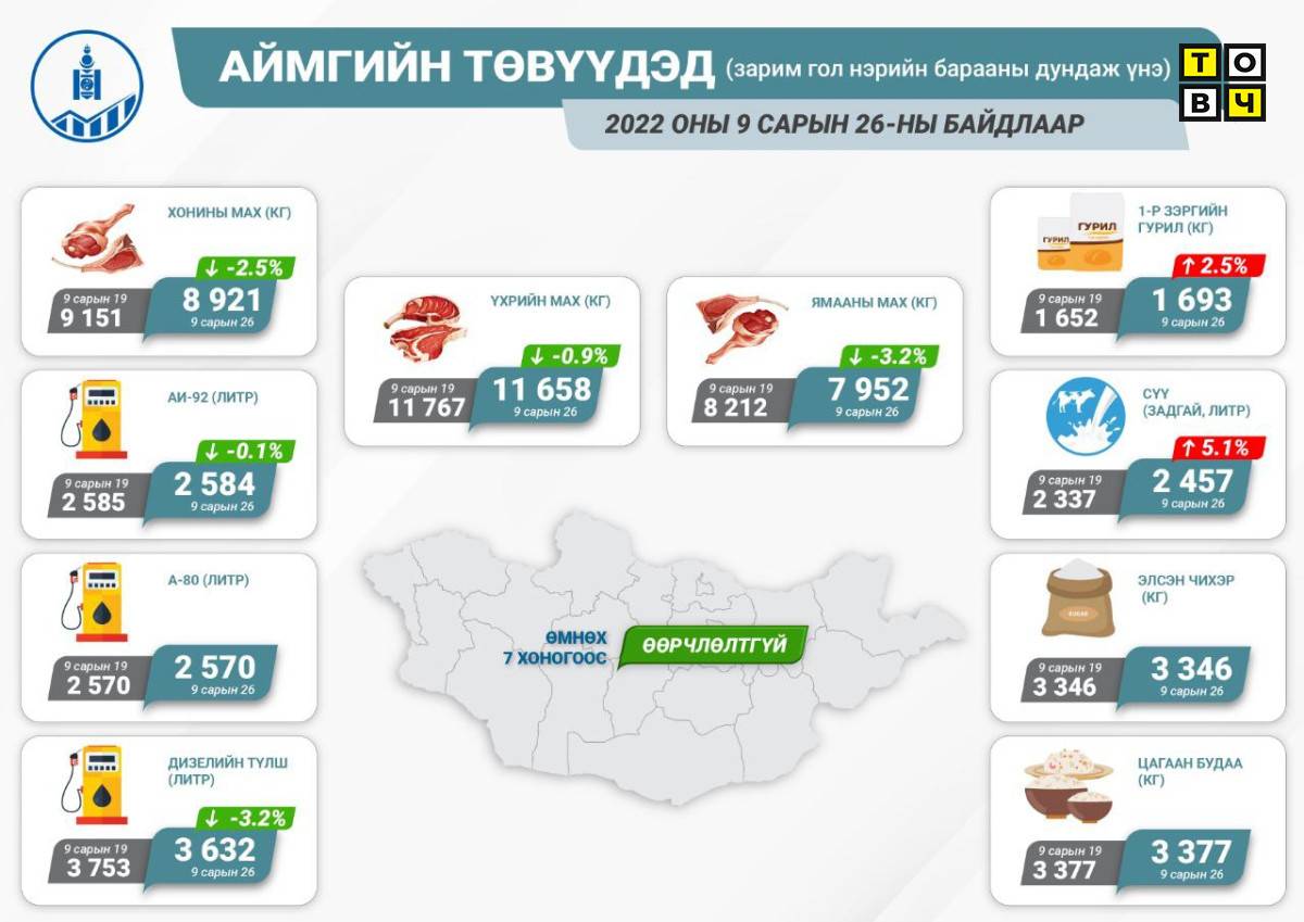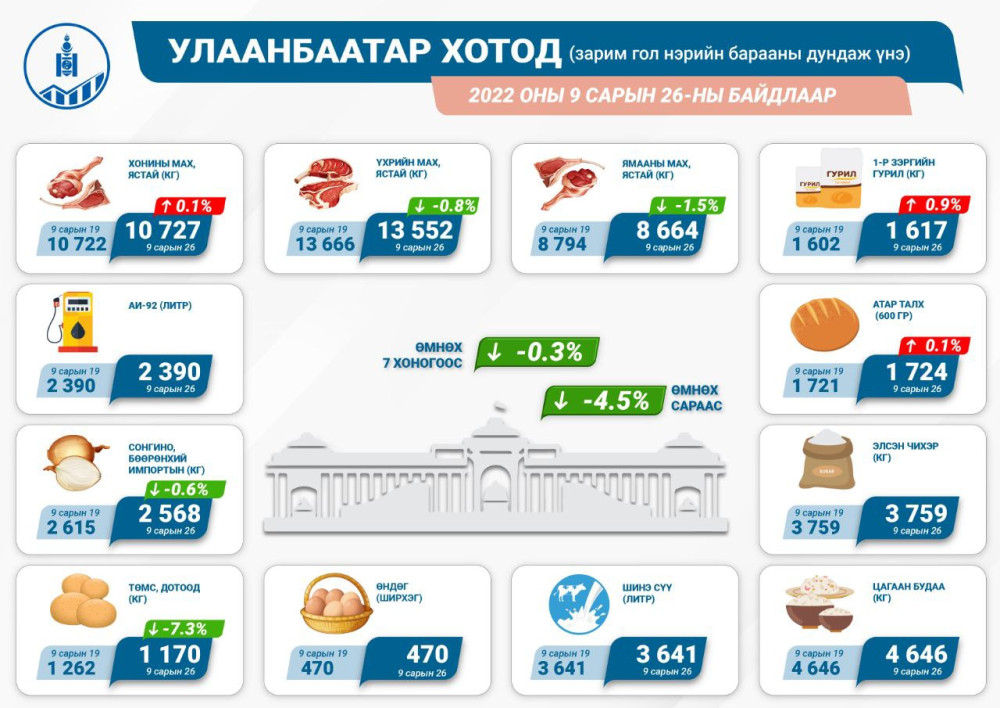 2022 оны 9 дүгээр сарын 26-ны байдлаар хүнсний гол нэрийн барааны үнэ Улаанбаатар хотод өмнөх сараас 4.5 хувиар, өмнөх 7 хоногоос 0.3 хувиар тус тус буурсан байна.