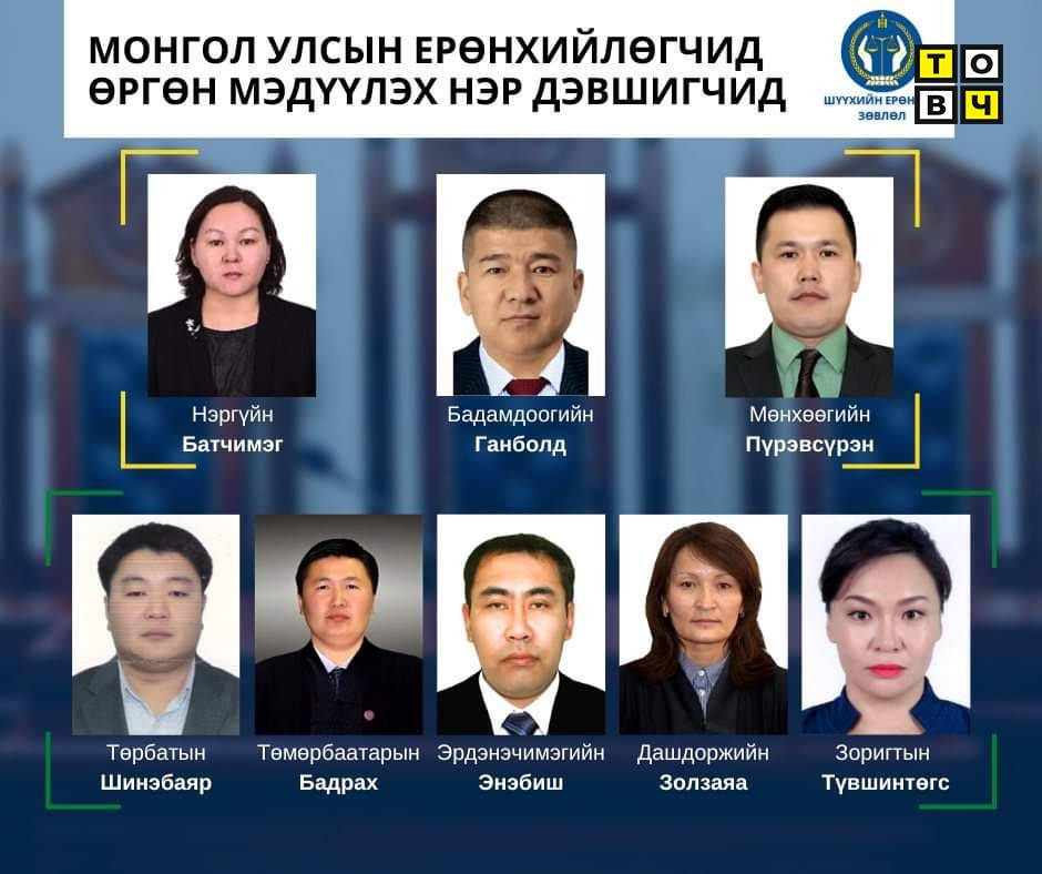 Мөнхөөгийн Пүрэвсүрэн, Бадамдоогийн Ганболд нарыг Монгол Улсын Дээд шүүхийн Эрүүгийн хэргийн танхимын шүүгчээр, Нэргүйн Батчимэгийг Монгол Улсын Дээд шүүхийн Иргэний хэргийн танхимын шүүгчээр нэр дэвшүүлж, томилуулах саналаа Монгол Улсын их хуралд танилцуулснаар Монгол Улсын Ерөнхийлөгчид өргөн мэдүүлэхээр болов.