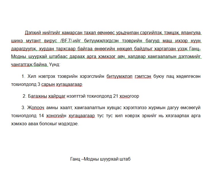 БНХАУ-ын Ганц мод боомтоос дараах мэдэгдлийг гаргажээ. Тус боомт шинэ мутант вирус битүүмжлэгдсэн тээврийн хэрэгслүүдээр хурдан тархсаар байгаа тул өнөөдрөөс эхлэн халдвар хамгааллын дэглэмийг чангатгахаар болжээ. Тиймээс тээврийн хэрэгслийн битүүмж гэмтсэн тохиолдолд 3 сар, багажны хайрцаг нээлттэй тохиолдолд 21 хоног, Журмын дагуу амны хаалт, хувцсаа өмсөөгүй тохиолдолд 14 хоног хилээр гарах эрхийг нь хязгаарлахаар болсон байна.