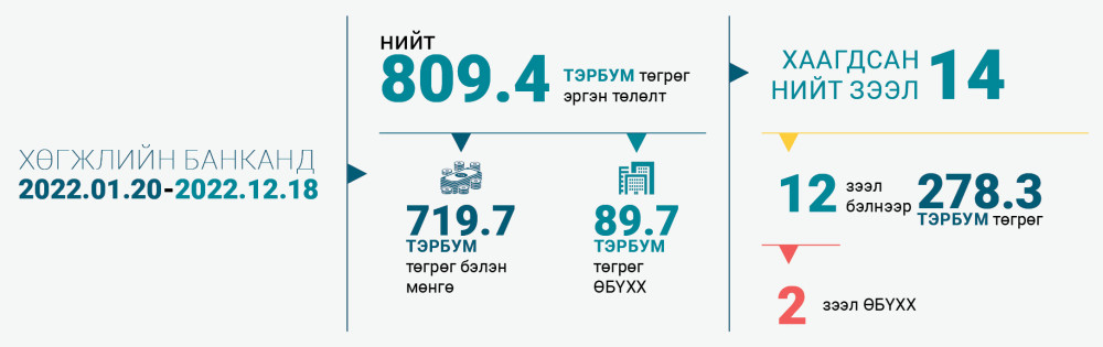 Хөгжлийн банканд 2022 оны 1 дүгээр сарын 20-ны өдрөөс хойш 12 дугаар сарын 18-ны өдрийг хүртэлх хугацаанд нийт 809.4 тэрбум төгрөгийн зээлийн эргэн төлөлтийг хийсэн.