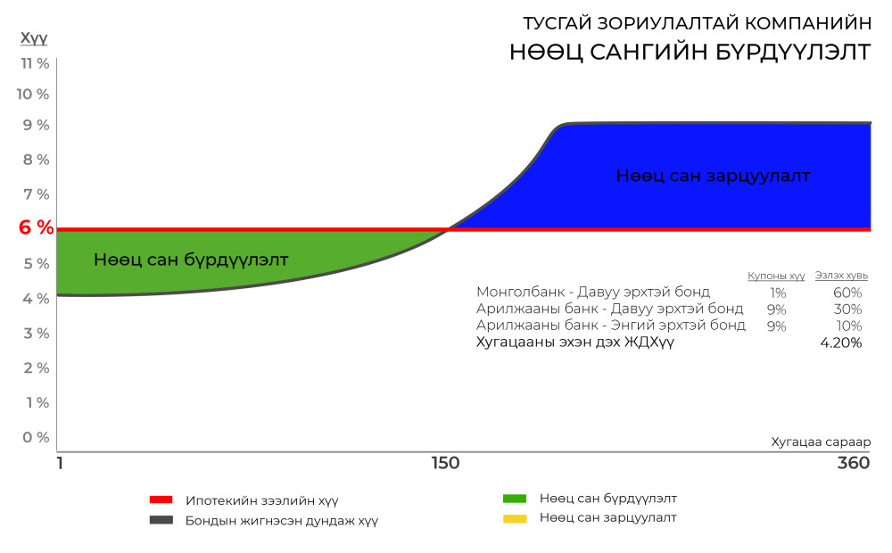 Давуу эрхтэй бондын үлдэгдэл багасах тусам бондын жигнэсэн дундаж хүү өсч, улмаар ипотекийн 6 хувийн хүүгийн орлогоос илүү гарах үед нөөц сангаас зөрүүг төлөх зориулалттай.