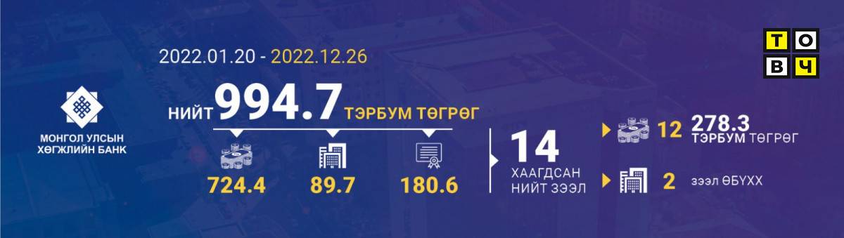 Хөгжлийн банк 2022 оны 1 дүгээр сарын 20-ны өдрөөс хойш 12 дугаар сарын 26-ны өдрийг хүртэлх хугацаанд нийт 994.7 тэрбум төгрөгийн зээл барагдууллаа. Үүнээс 724.4 тэрбум төгрөгийг бэлэн мөнгөөр, 89.7 тэрбум төгрөгийг өмчлөх бусад үл хөдлөх хөрөнгөөр, 180.6 тэрбум төгрөгийг үнэт цаасаар төвлөрүүлээд байна.