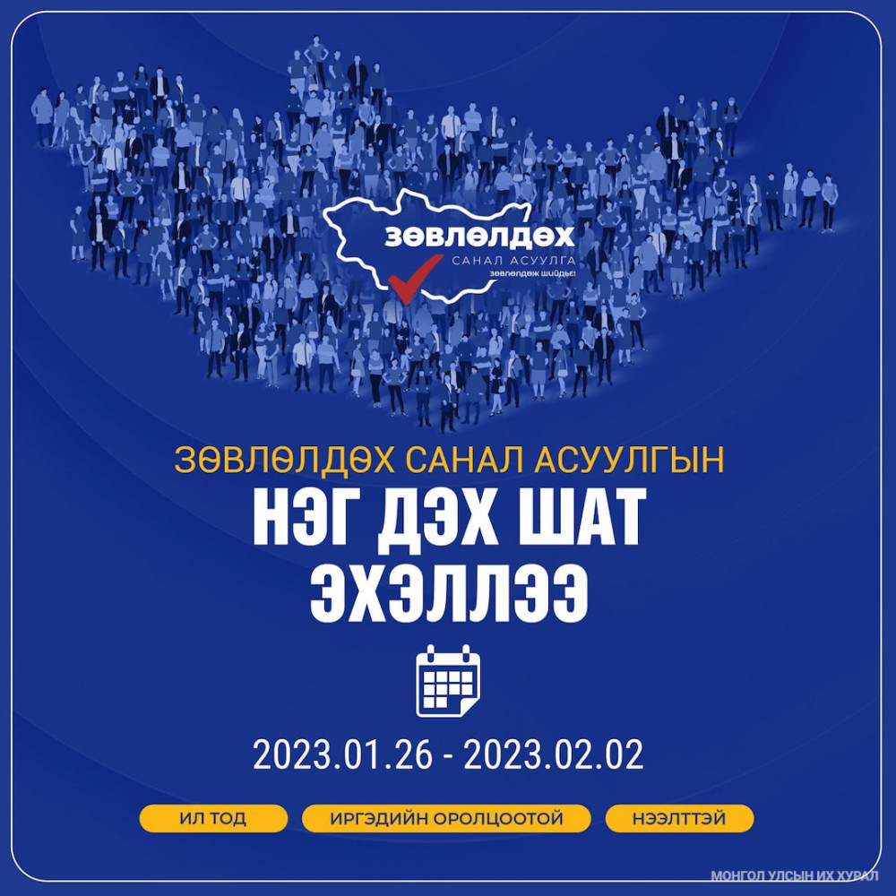 Улс орны нийгэм, эдийн засгийн тулгамдсан асуудлыг иргэдийн туслалцаатайгаар тодорхойлох, асуудлын эрэмбэ, шийдвэрлэх арга зам, гаргах шийдвэрийн талаар иргэдтэй зөвлөлдөх, үндэсний зөвшилцлийг хангах зорилготой “Зөвлөлдөж шийдье” зөвлөлдөх санал асуулгын нэг дэх шат өнөөдрөөс (2023.01.26) орон даяар эхэлж байна.