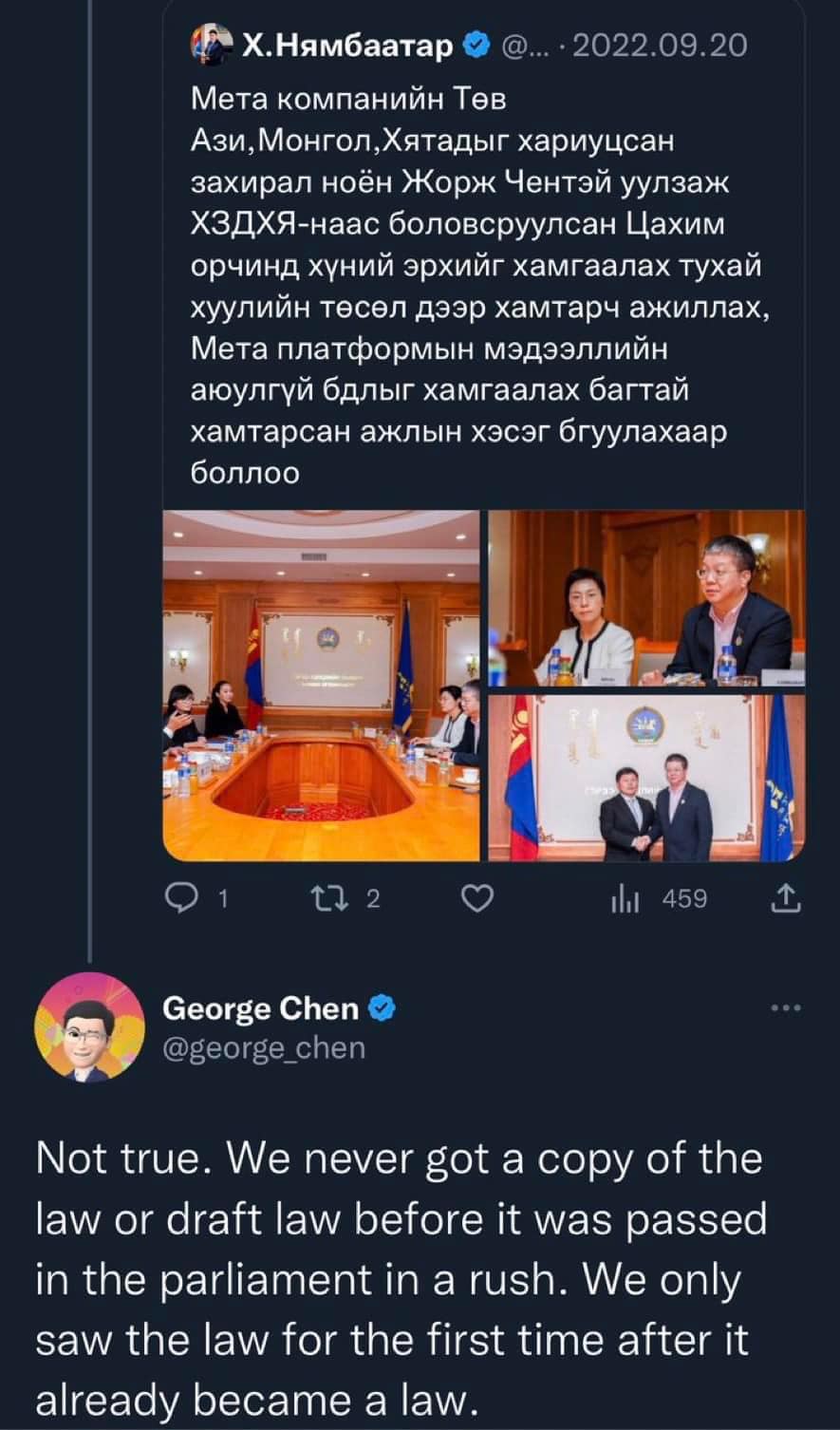 Хууль зүй, дотоод хэргийн сайд Х.Нямбаатарын жиргээ олны анхаарлыг татаад байна. Тэрбээр өчигдөр /2023.01.26/ Мета компанийн Төв Ази, Монгол, Хятадыг хариуцсан захирал Жорж Чентэй уулзсан уулзалтынхаа талаар "ХЗДХЯ-наас боловсруулсан Цахим орчинд хүний эрхийг хамгаалах тухай хуулийн төсөл дээр хамтарч ажиллах, Мета платформын мэдээллийн аюулгүй байдлыг хамгаалах багтай хамтарсан ажлын хэсэг байгуулахаар боллоо” гэсэн.