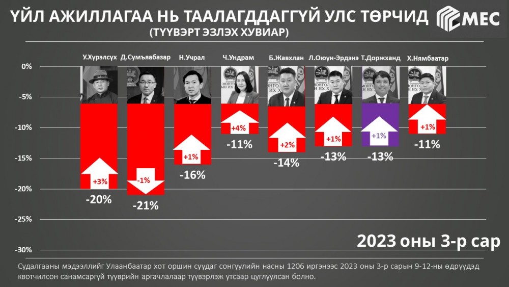Судалгааны дүнгээс харахад үйл ажиллагаа нь таалагддаггүй улстөрчийг Нийслэлийн Засаг дарга бөгөөд Улаанбаатар хотын захирагч Д.Сумъяабазар тэргүүлжээ.