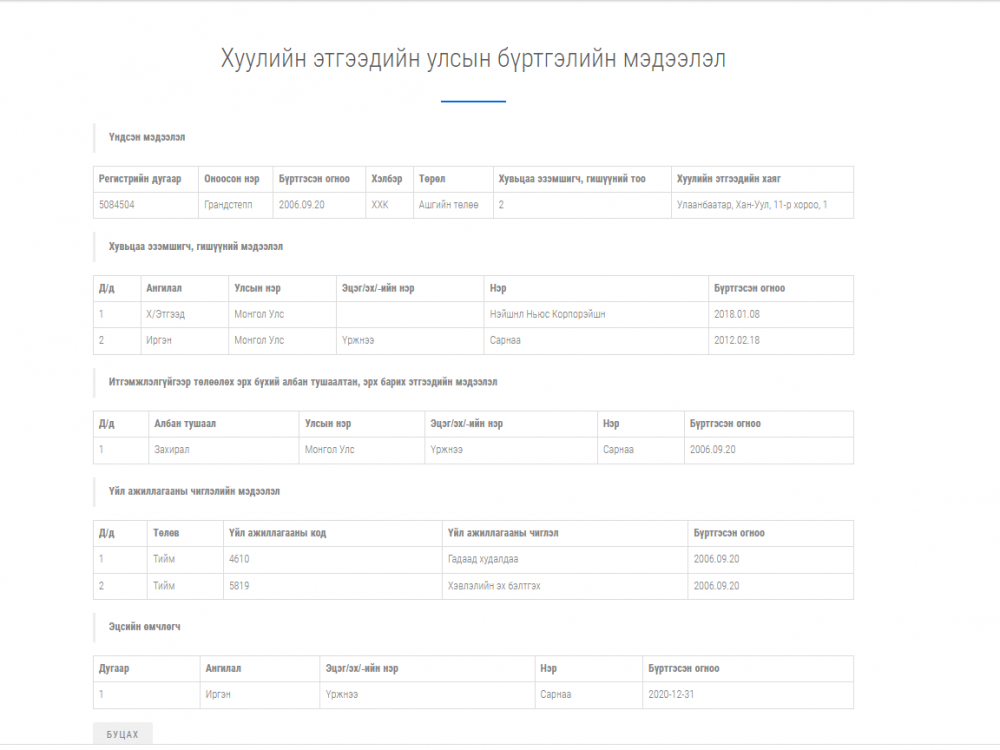 “Гранд Степп” ХХК-ийг 2006 оны есдүгээр сарын 20-нд Гадаад худалдаа, Хэвлэлийн эх бэлтгэх чиглэлээр үйл ажиллагаа явуулахаар Улсын бүртгэлд 5084504 регистрийн дугаараар Улаанбаатар, Хан-Уул, 11-р хороо, нэг тоот хаяг дээр Ү.Сарнаа гэж хүний нэр дээр анх бүртгэгджээ. Ү.Сарнай нь ТЕГ-ын дарга асан Б.Хурцын эхнэр юм.