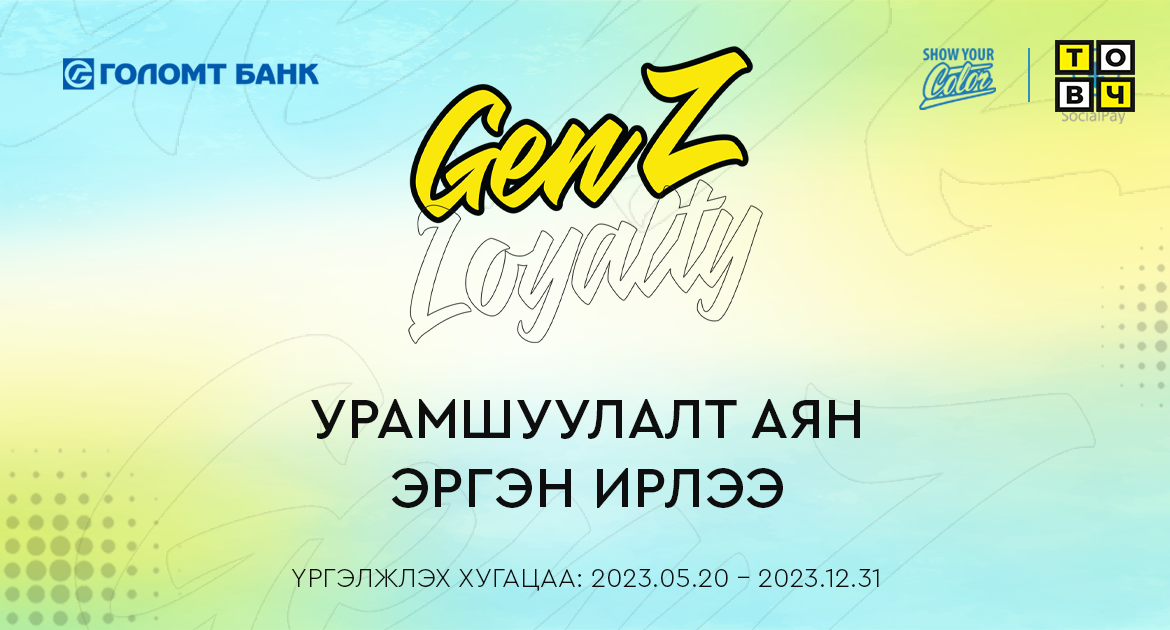 Голомт банк шинэ үеийн харилцагчдадаа зориулан GenZ Loyalty оноотой хөтөлбөрөө дахин хэрэгжүүлж эхэллээ. Энэ хөтөлбөрийн хүрээнд 7-26 насны харилцагч та The Color Card болон SocialPay ашиглах бүрдээ оноо цуглуулж, цуглуулсан оноогоороо сонгогдсон байгууллагуудын хөнгөлөлтийн купонооос авах боломжтой.