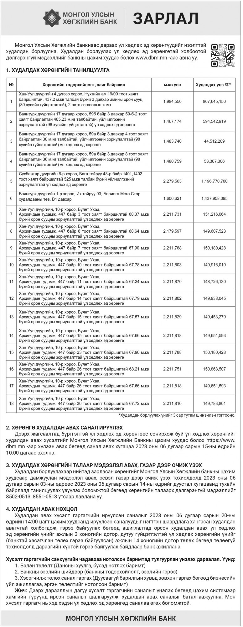 Энэ удаа бүрэн ашиглалтад орсон болон дутуу гүйцэтгэлтэй дуусаагүй барилга болох Хөгжлийн банканд бүртгэлтэй нийт 179.3 тэрбум төгрөгийн үл хөдлөх хөрөнгийг худалдан борлуулахаар олон нийтэд мэдээлэл хүргэж байна.
