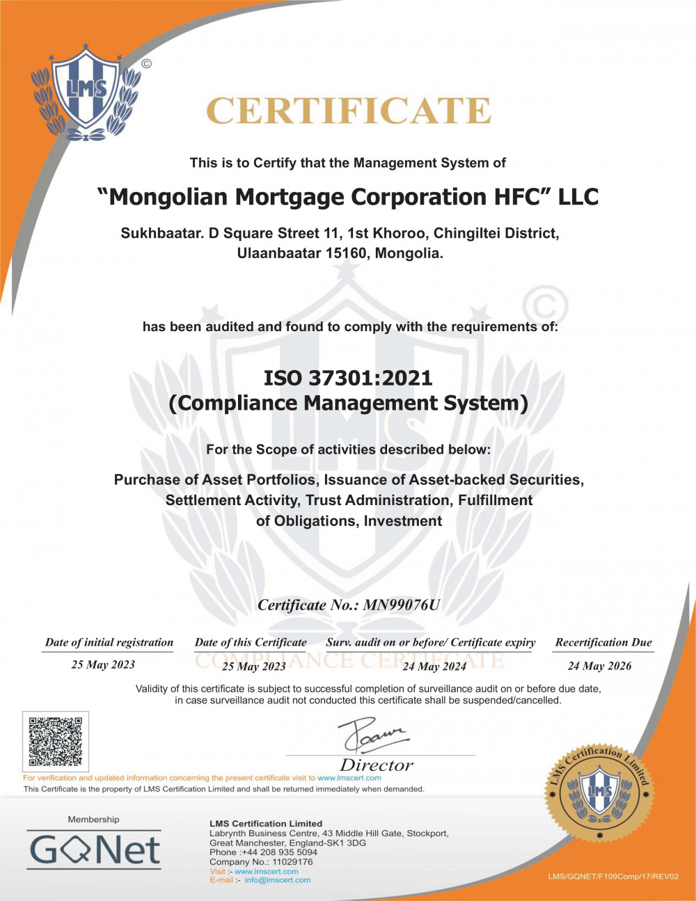 Ипотекийн хоёрдогч зах зээлийг хөгжүүлж, хөрөнгөөр баталгаажсан үнэт цаасжуулах үйл ажиллагаа явуулдаг, санхүүгийн мэргэжлийн байгууллага болох Монголын ипотекийн корпораци нь олон улсын Комплаенсийн менежментийн ISO 37301:2021 стандартыг үйл ажиллагаандаа бүрэн нэвтрүүллээ. Ингэснээр Комплаенсийн менежментийн олон улсын стандартын тогтолцоог хэрэгжүүлсэн санхүүгийн салбарын анхдагч байгууллага болж байна.