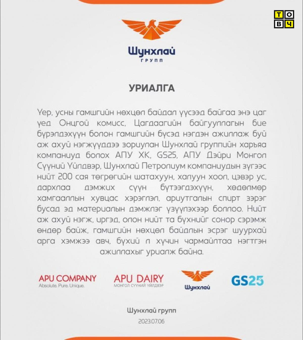 Үер, усны гамшгийн нөхцөл байдал үүсээд байгаа энэ цаг үед "Шунхлай Групп"-ийн харъяа компаниуд нэгдэж нийт 200 сая төгрөгийн дэмжлэг үзүүлэхээр боллоо.