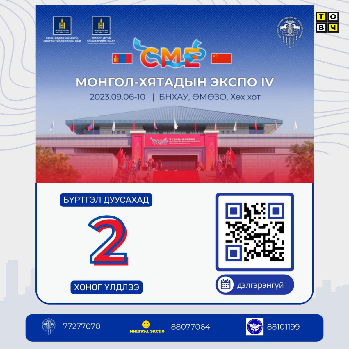 Монгол Улсын үндэсний үйлдвэрийн бараа бүтээгдэхүүнийг экспортлох боломж нөхцөлүүдийг нэмэгдүүлэх, хоёр орны бизнесийн харилцан түншлэлийг өргөтгөх, зах зээлд хамтран ажиллах зорилгоор 2023 оны 09 сарын 06-10 өдрүүдэд БНХАУ-ын ӨМӨЗО-ны Хөх Хотноо ‘’Монгол-Хятадын IV Экспо-2023” арга хэмжээг 4 дэх жилдээ зохион байгуулах гэж байна.