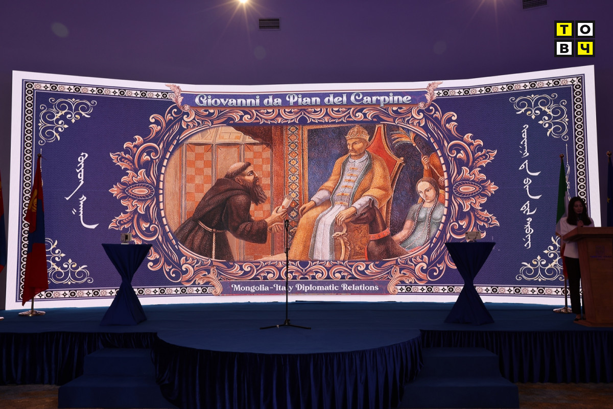 Монголбанкны Ерөнхийлөгч Б.Лхагвасүрэн энэ үеэр хэлсэн үгэндээ “Монгол Улс, Итали улсын хоорондын дипломат харилцаа нь өнө эртний түүхтэй бөгөөд 1246 он буюу Монголын эзэнт гүрний үед IV Пап Инночензогийн илгээсэн захидлыг Италийн Дипломат элч Жиованни Пиан Дэл Карпини Гүюг хаанд бараалхан гардуулж байсан түүхтэй. Түүний Гүюг хаанд бараалхаж буй мөчийг Итали улсын зураач Жэрардо Дотторигийн зурснаар 1949 онд Плано Карпинигийн төрөлх нутаг болох Мажионэ хотын захиргааны зөвлөлийн танхимын хананд мөнхөлсөн байдаг. Тус бүтээлийг “Монгол-Итали” дурсгалын ялтсан зоосонд дүрсэлсэн.” гэв.