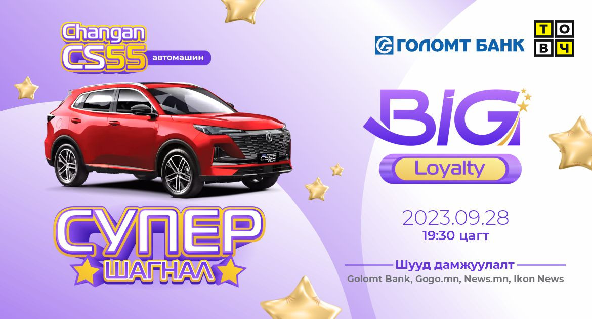 Харин автомашин болон 1 өрөө байрны шагналтай супер урамшууллын эхний ялагч буюу Changan CS55 автомашины эзнийг тун удахгүй тодруулах гэж байна. Ялагчийг 2023.09.28-ны өдрийн 19:30 цагт дараах Facebook хуудсуудаар шууд дамжуулан тодруулах тул Big Loyalty хөтөлбөрийн оноогоороо урамшууллын эрх авсан хүмүүс шууд дамжуулалттай хамт байж, супер ялагч болох эсэхээ шалгаарай.
