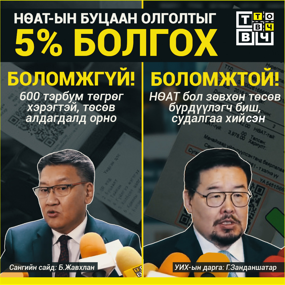 - НӨАТ бол манай төсвийн хамгийн тогтвортой хэсэг. Ирэх онд буцаан олголтод 400 тэрбум төгрөг оногдоно. Харин 5% болговол нэмж 600 гаруй тэрбум төгрөг шаардагдана. Энэ бол маш өндөр дүн. Ирэх оны төсвийн төслийг өргөн барьсан, маргааш хэлэлцэж эхлэх гэж буй энэ үед ийм асуудал байх боломжгүй.