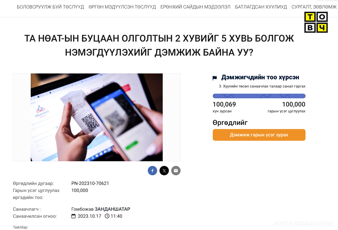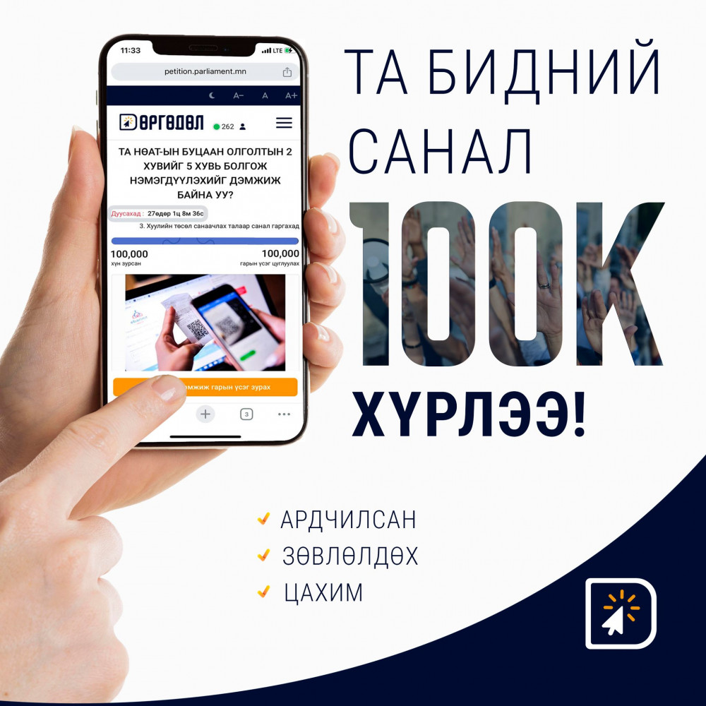 Дээрх саналыг petition.parliament.mn цахим системд 2023.10.17-ны 11 цаг 40 минутад байршуулснаас хойш зургаа хоногийн хугацаанд дэмжсэн иргэдийн тоо 100 мянгад хүрлээ.