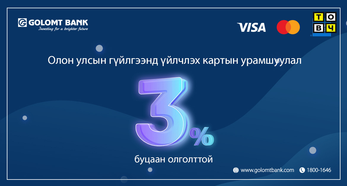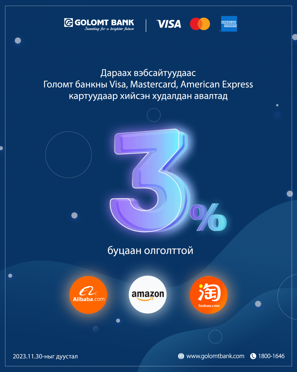Хэрвээ та Голомт банкны Visa, Master, American Express брэндийн картын харилцагч бол картаараа доор дурдсан вэбсайтуудаас онлайн худалдан авалт хийж, төлбөрөө төлөөд үнийн дүнгийнхээ 3%-ийг буцаан аваарай.