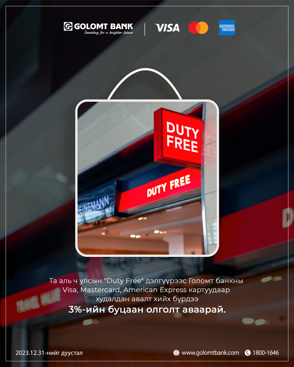 Мөн 2023.12.31-нийг дуустал гадаадад аялахдаа аль ч улсын DUTY FREE дэлгүүрээс сонгогдсон картуудаар худалдан авалт хийгээд 3%-ийн буцаан олголт авах боломжтой давхар урамшуулал хэрэгжиж байна.