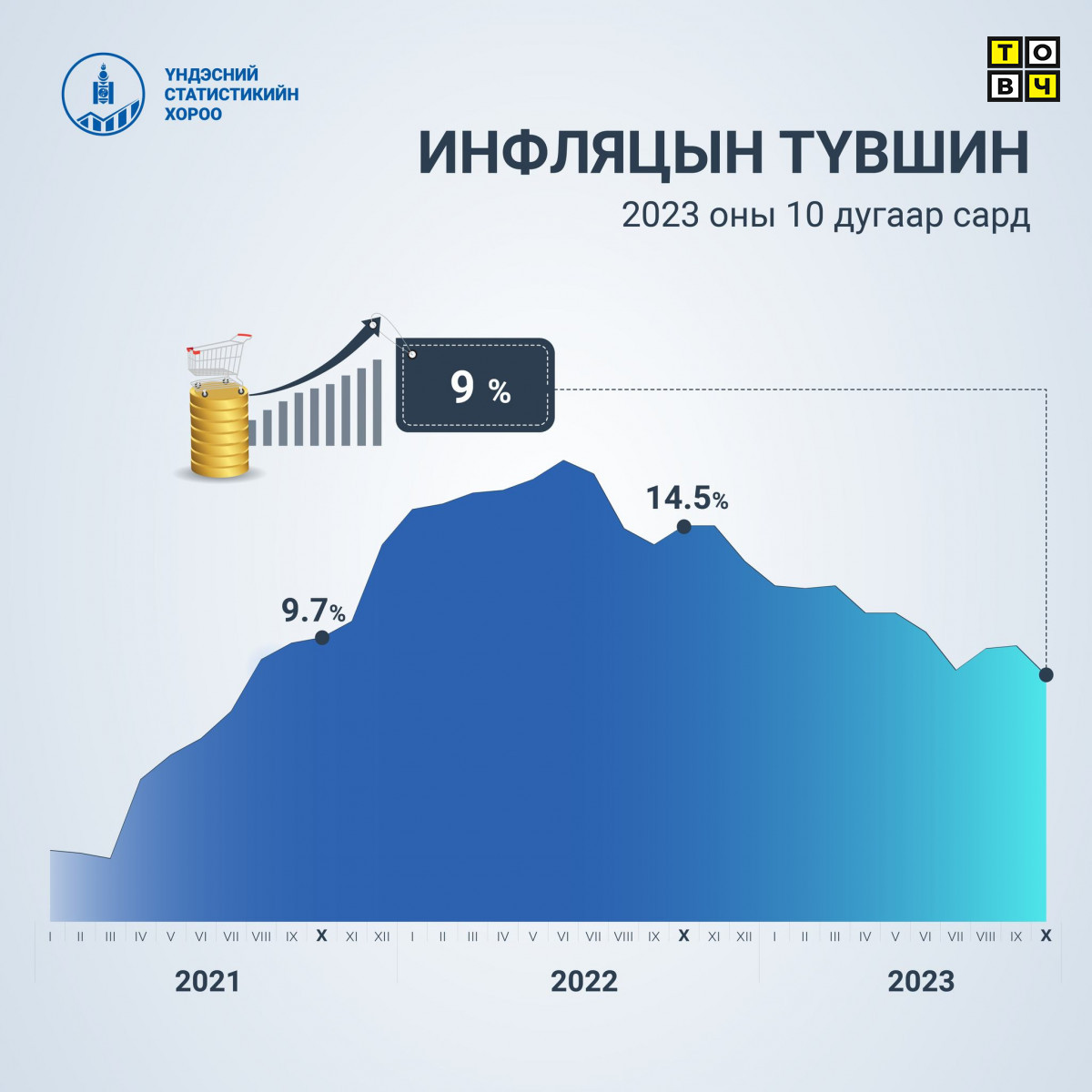 Хэрэглээний бараа, үйлчилгээний үнэ 2023 оны 10 дугаар сард улсын хэмжээнд өмнөх оны мөн үеэс 9.0 хувь, өмнөх оны эцсээс 6.7 хувь, өмнөх сараас 0.3 хувиар тус тус өссөн байна.