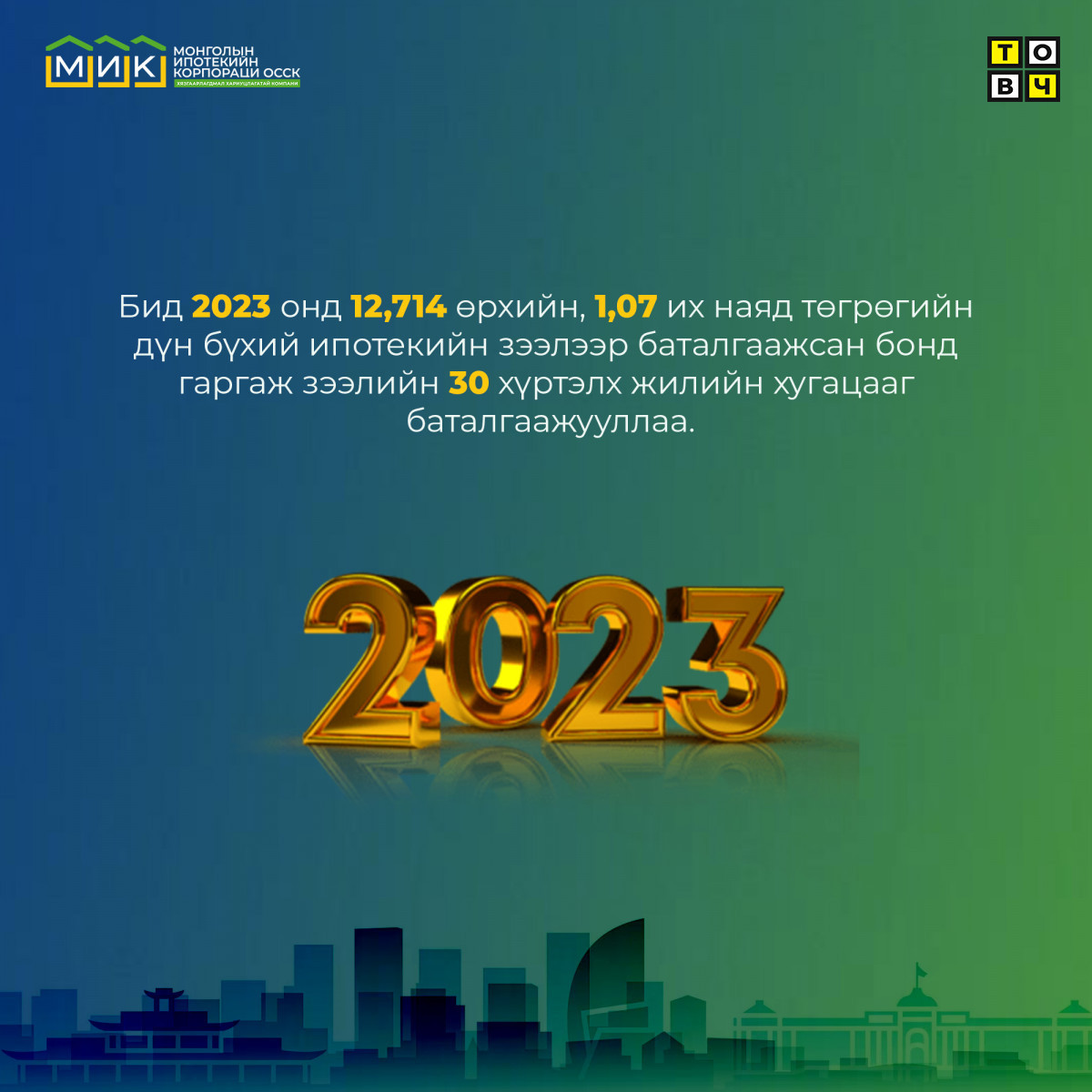 Ингэснээр бид 2023 онд 12,714 өрхийн, 1,07 их наяд төгрөгийн дүн бүхий ИЗББ гаргаж зээлийн 30 хүртэлх жилийн хугацааг баталгаажууллаа.