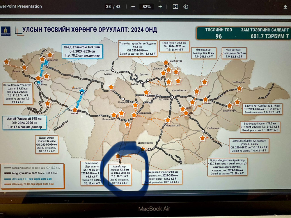 Гэсэн ч Дазанзадгадаас Гурвантэс хүрэх энэ 302 км замд одоогоор улсын төсвөөс сохор зоосны ч хөрөнгө оруулалт орж ирээгүй байна. Ковидын дараахан МУ-ын #2 хүн /Ерөнхий сайд Л.Оюун-Эрдэнэ/ Өмнөговьд очихдоо 302 км-ийн 80км-ийг нь улсын төсвийн хөрөнгө оруулалтаар тавьж өгөхөө амлаад явсан билээ. Эл амлалтынхаа эхлэл болгож 2024 онд 10 гаруй тэрбум төгрөг төсөвлөсөн байсан. Км нь 1.7 тэрбумаар босож байгаа гэж тооцвол ирэх онд үсрээд л 5-6 км л тавигдана гэсэн үг.