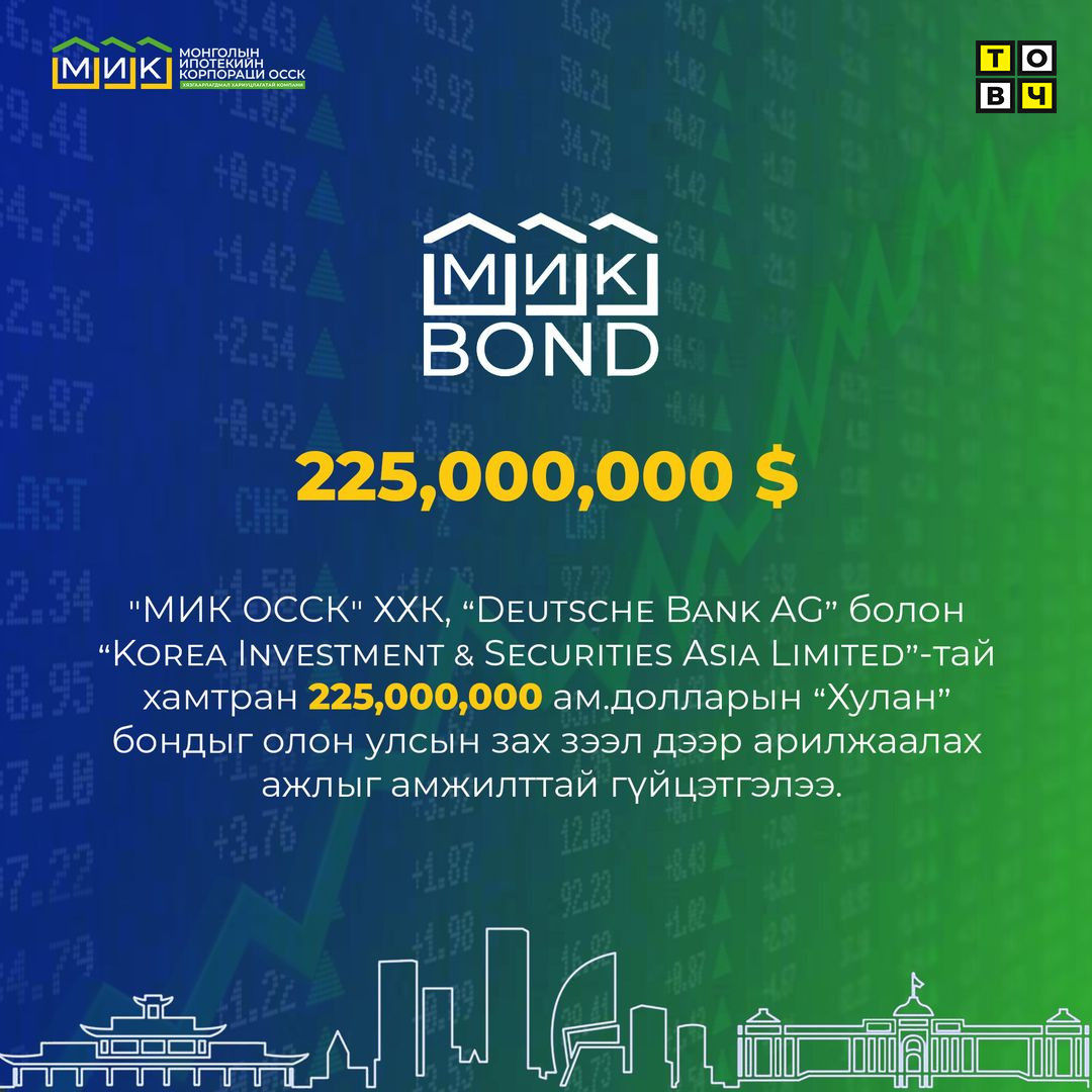 "МИК ОССК" ХХК 225 мянган ам.долларын шинэ бондыг олон улсын хөрөнгийн зах зээл дээр амжилттай арилжаалжээ.