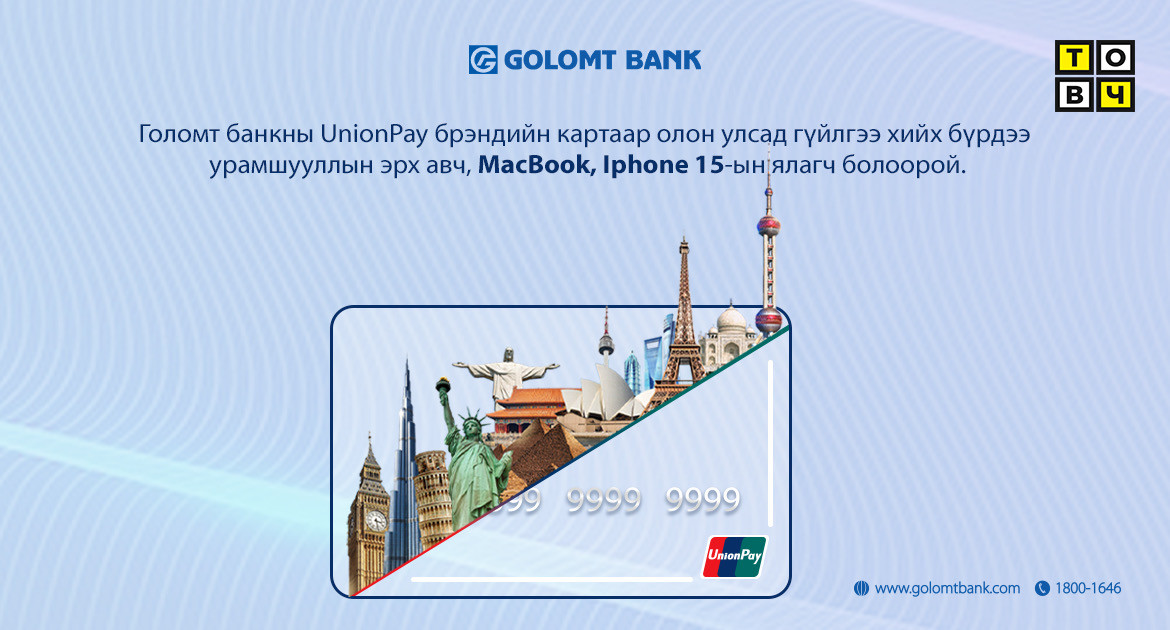 Голомт банкны зүгээс урамшуулалт аяны хүрээнд дахин 2азтай харилцагчийг тодруулж, MacBook Air болон Iphone 15 гар утас бэлэглэх гэж байна. Та 2024.01.15-2024.02.14-ний хооронд Голомт банкнаас гаргадаг UnionPay брэндийн виртуал болон биет картаар олон улсад хийсэн гүйлгээний дүнгийнхээ 100,000₮ тутамдаа шагналын төлөө өрсөлдөх 1ш урамшууллын эрх аваарай.