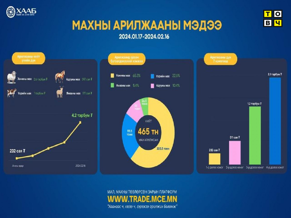 Малчид хөдөө аж ахуйн биржээр дамжуулан хонь, үхэр, ямаа, адууны махыг арилжаалж байгаа бөгөөд нэг сарын хугацаанд нийт 465 тонн мах буюу 4.2 тэрбум төгрөгийн мал, махны арилжаа хийгдээд байна.