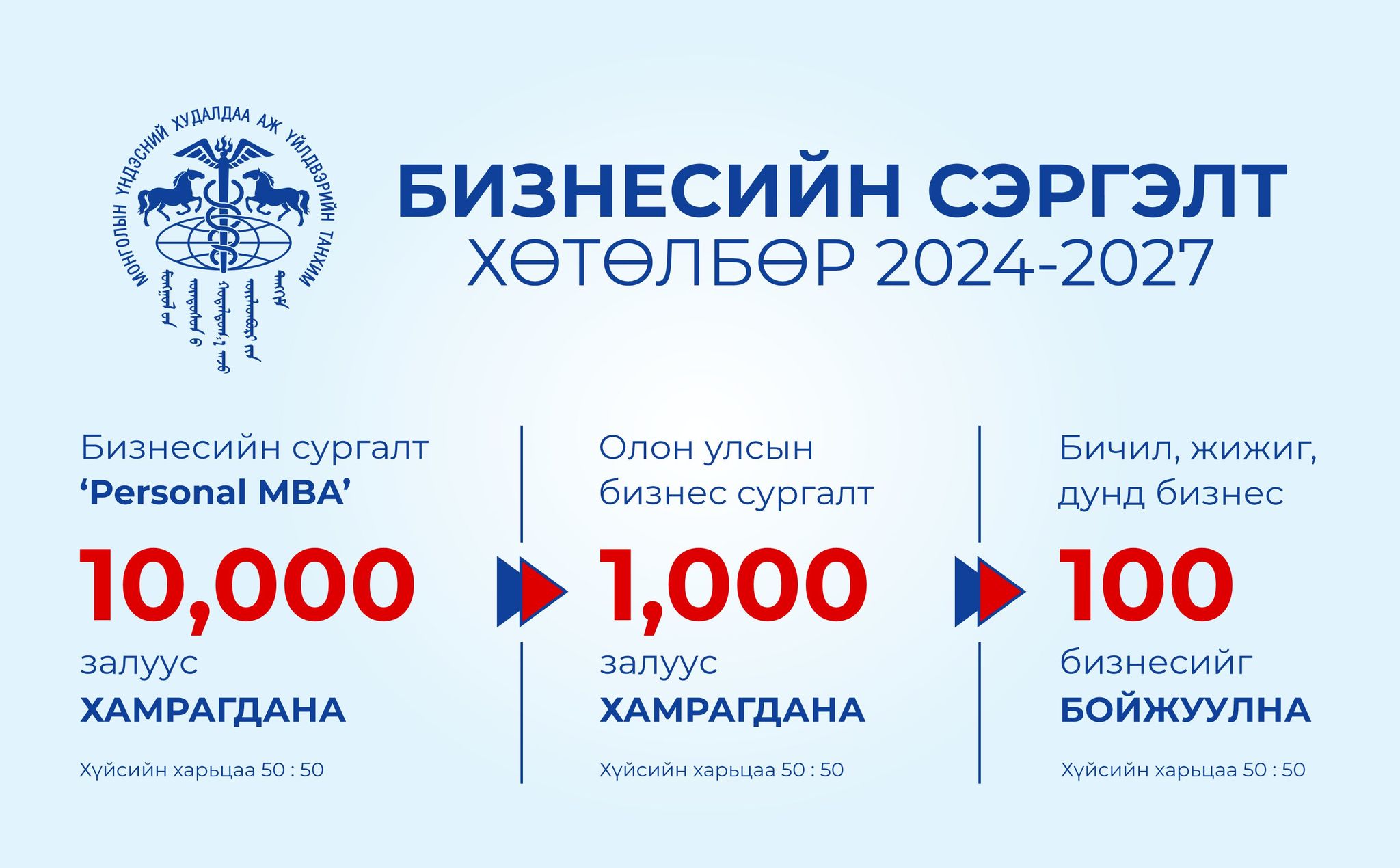 Засгийн газраас боловсруулсан Шинэ сэргэлтийн бодлогыг дэмжиж “Бизнесийн сэргэлт” хөтөлбөрийг МҮХАҮТ-аас боловсруулжээ. Үүний эхлэл болгож 10000 залуусыг Бизнесийн сургалтад хамруулах хөтөлбөрийг эхлүүлж байгаагаа өнөөдөр зарлалаа.