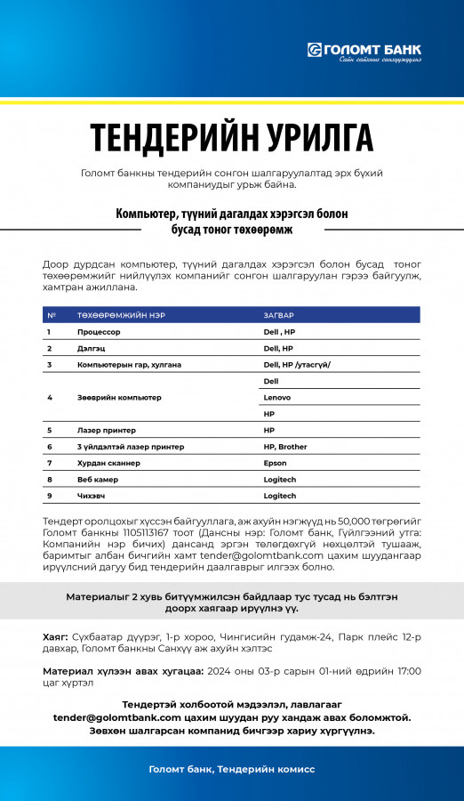 ГОЛОМТ БАНК: Тендерийн урилга