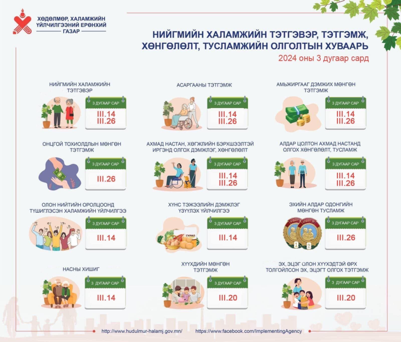 Нийгмийн халамжийн тэтгэвэр, тэтгэмж, хөнгөлөлт, тусламжийн гуравдугаар сарын хуваарь гарчээ.