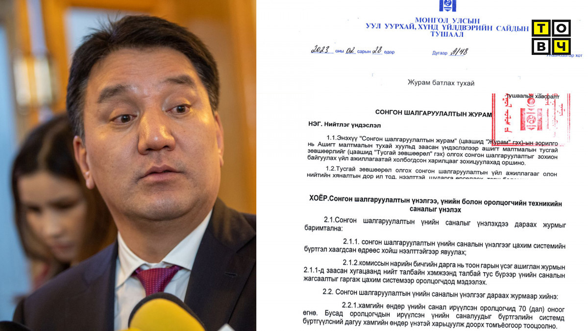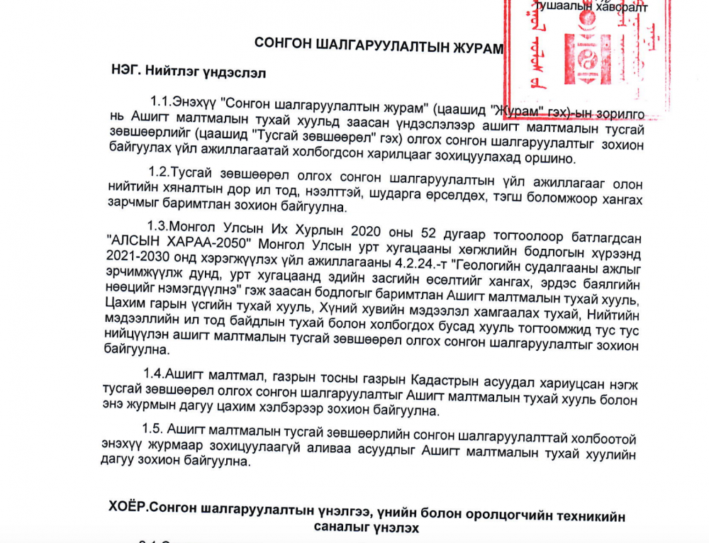 Учрыг сийрүүлье. Ашигт малтмалын тусгай зөвшөөрөл олгох “Сонгон шалгаруулалт” нь геологийн судалгааны ажлыг эрчимжүүлэх, дунд, урт хугацааны эдийн засгийн өсөлтийг хангахад чиглэсэн байдаг. Тодруулбал Монгол орны 21 аймаг, 330 сумын нутаг дэвсгэрт алт, нүүрс зэрэг ашигт малтмал байгаа эсэхэд хайгуулж хийж, хайгуулын үр дүнд уул уурхайн нөөц баялагтай том том ордуудыг илрүүлэхэд тендерийн зорилго оршдог. Гэтэл энэ тендерт оролцох шалгаруурыг Ж.Ганбаатар сайд болонгуутаа өөрчилж, дэнчингийн хувийг нэмэгдүүлжээ.