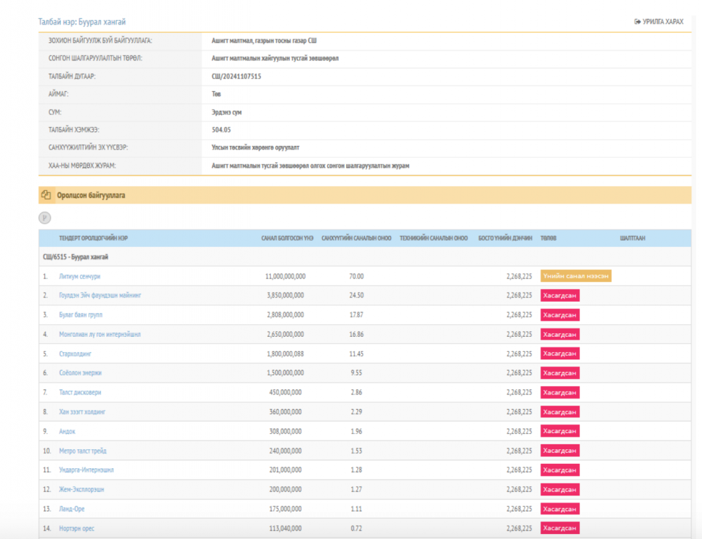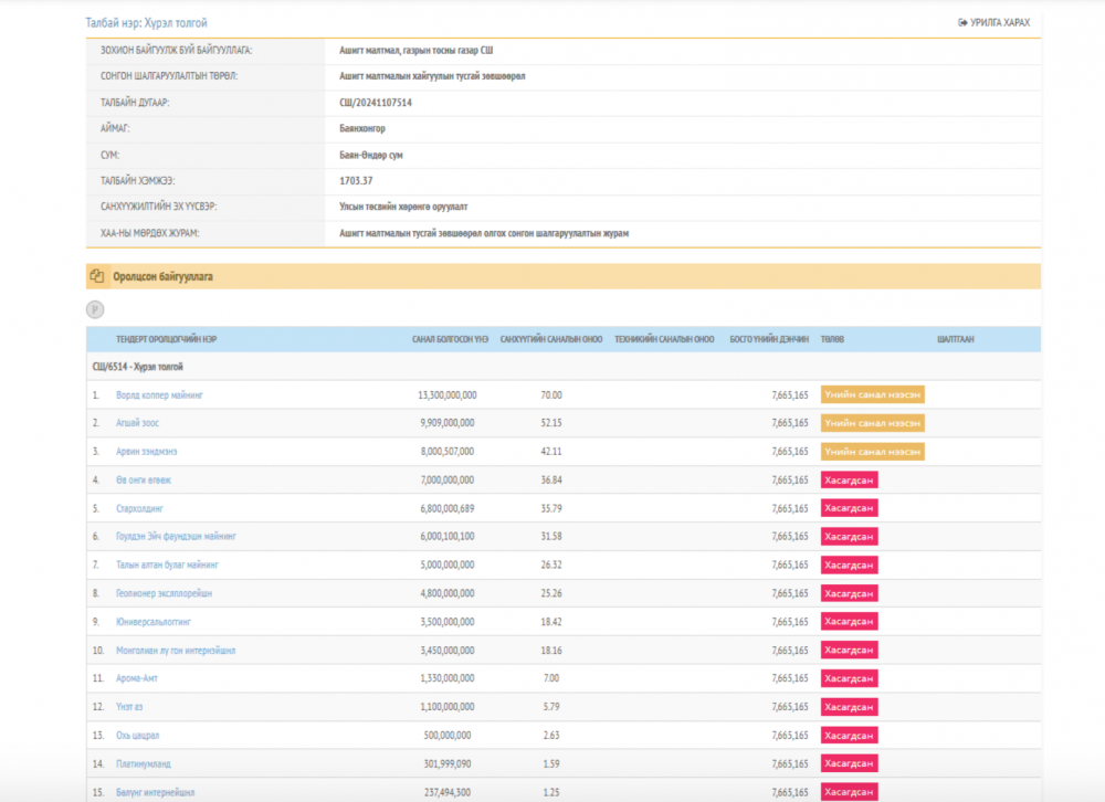 Сонгон шалгаруулалтын босго нь мөнгө болж, хэн их мөнгөн дүн тавина тэр компани тендерт шалгарч, ашигт малтмалын лиценз авдаг гаж тогтолцоо суучихаад байна. Ганцхан жишээ дурдъя. Төв аймгийн Эрдэнэ сумын Буурал хангай хэмээх газарт хайгуул хийхээр Ашигт малтмалын тусгай зөвшөөрөл олгох “Сонгон шалгаруулалт” буюу тендер зарлажээ. Уг тендерт гадаадын хөрөнгө оруулалттай компаниуд нь хэдэн арван тэрбум төгрөгийн дэнчин тавьсан бол дотоодын компаниуд нь хэдхэн сая төгрөгийн дэнчин тавьснаар хасагдсан байх юм. Түүнчлэн дөнгөж өчигдөрхөн нээсэн тендер мөн л дээрх дүр зураг давтагджээ.
