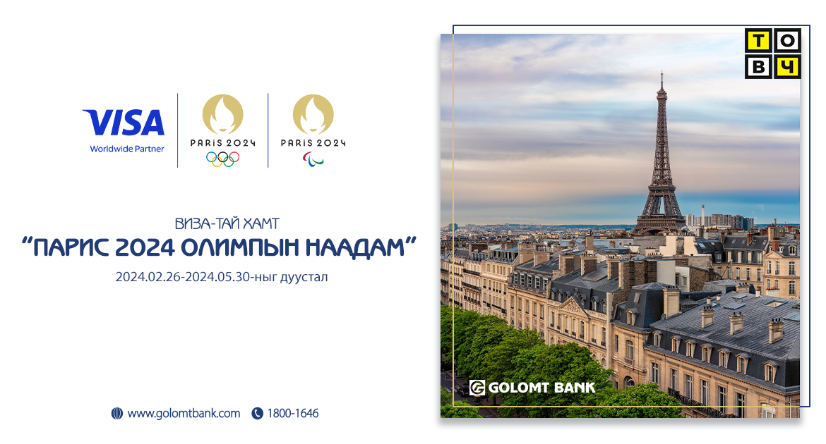 Хүн төрөлхтний эв нэгдлийн бэлгэ тэмдэг болсон 2024 оны зуны олимпыг зорих ээлжит тасалбар “Парис-2024 олимпын наадам” картын урамшуулалт аян зарлагдлаа. Урамшуулалт аяны хүрээнд 2024.02.26-2024.05.30-ны хооронд Голомт банкнаас гаргадаг Visa брэндийн бүх төрлийн картын харилцагчид гүйлгээ хийх бүрдээ сугалаа авч, олимпын наадам үзэнгээ Парис хот руу ХОСООРОО аялах эрхийн ялагч болоорой.