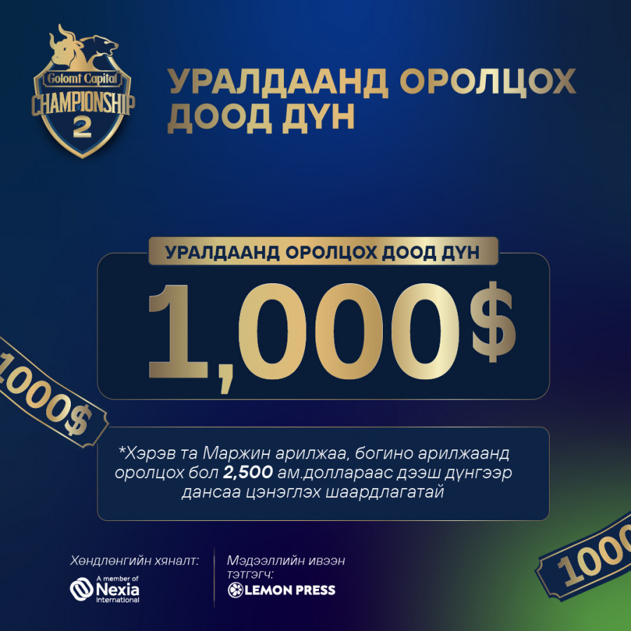 Тэгвэл энэ удаад зохион байгуулагдах “GОLOMT CAPITAL CHAMPIONSHIP-2” гадаад арилжааны уралдааны ялагчаар 3 хүн тодруулахаараа онцлогтой.