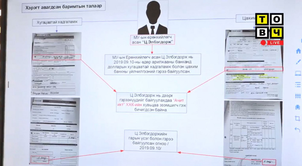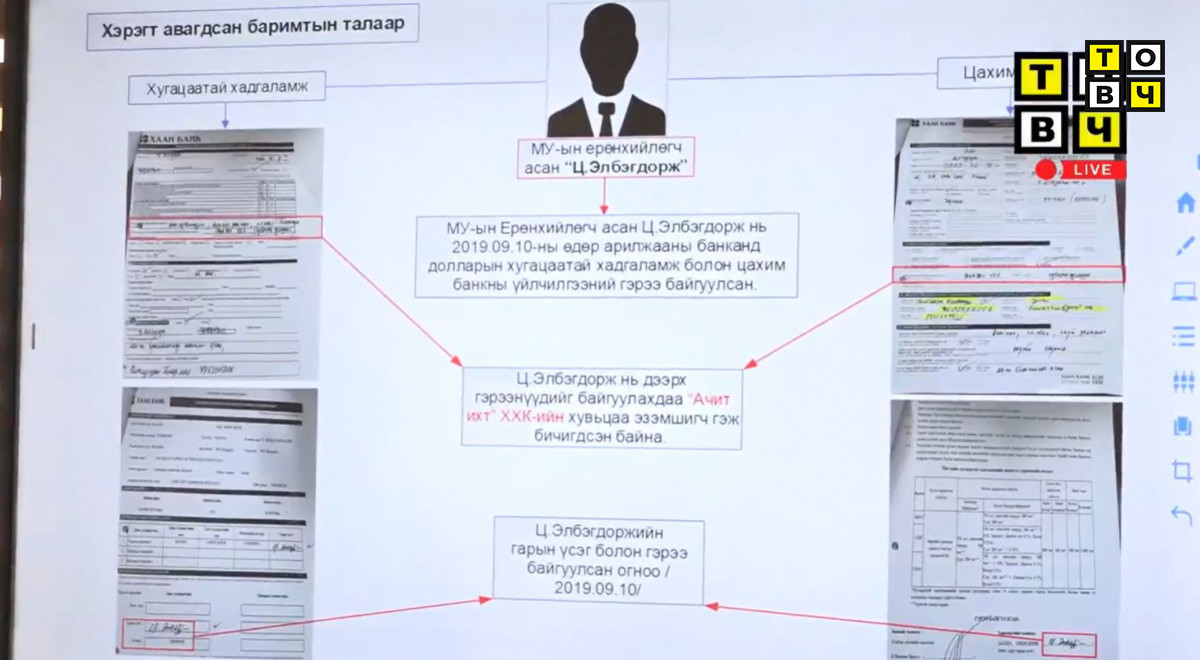 - Ерөниийлөгч асан Ц.Элбэгдорж 2019 оны 9 дүгээр сарын 10-ны өдөр арилжааны банкинд долларын хугацаатай хадгаламж болон цахим банкны үйлчилгээний гэрээ байгуулжээ. Ингэхдээ тэрбээр Ачит ИХТ ХХК -ийн хувьцаа эзэмшигчээр бүртгүүлсэн байна.