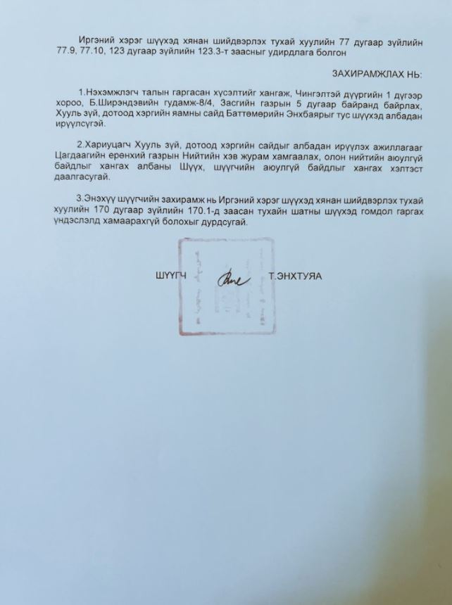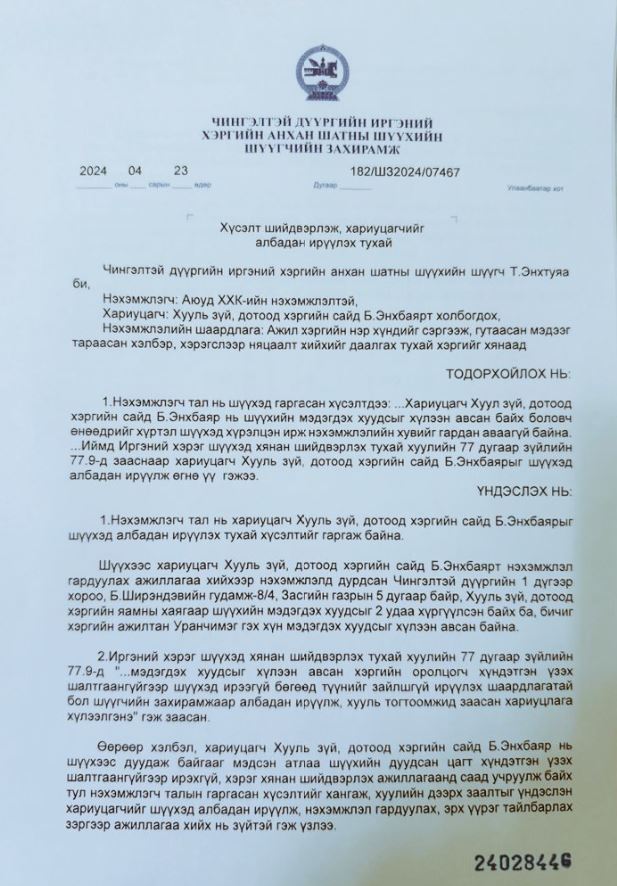Улмаар шүүх хүсэлтийг нь хангаж, албан ирүүлэх захирамж гаргасан байна.