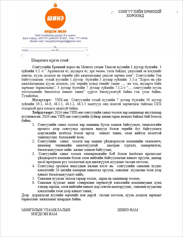 ШИНЭ нэгдсэн эвслийн гишүүд МАН, АН болон зарим горилогчид Үндсэн хууль, Сонгуулийн тухай хууль болон бусад хууль тогтоомж зөрчиж байгаатай холбогдуулан Сонгуулийн ерөнхий хороонд шаардлага хүргүүлж, мэдээлэл хийлээ.