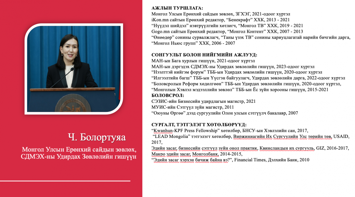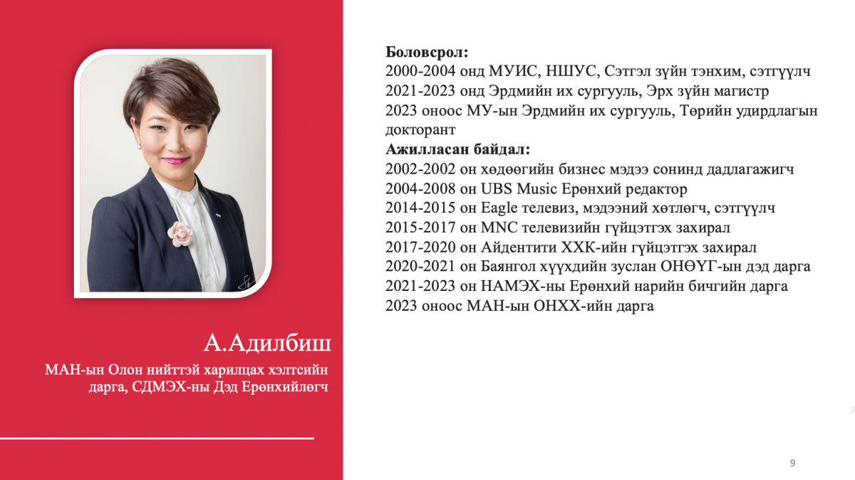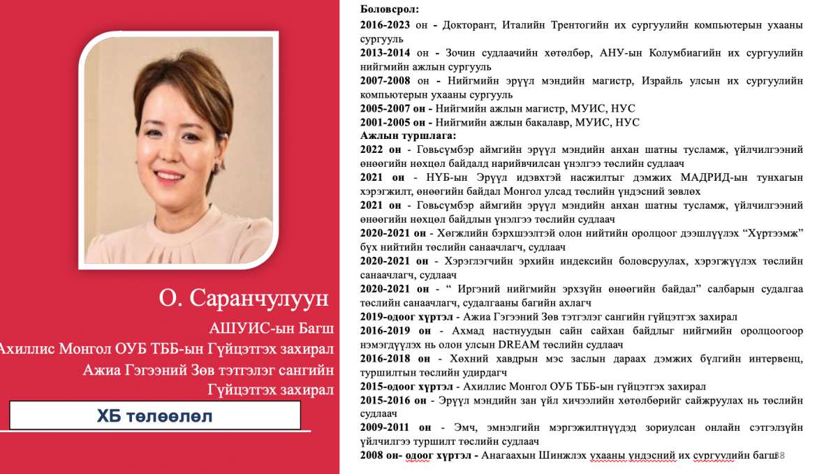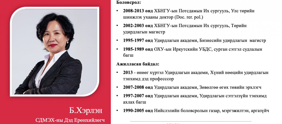 Тухайлбал, жагсаалтын 4-рт эрэмбэлэгдсэн О.Саранчулуун нь Италийн Трентогийн Их сургууль, АНУ-ын Колумбиагийн Их сургууль, Израйль улсын их сургууль зэрэгт магистр, докторант хамгаалсан бол жагсаалтын 8-рт эрэмбэлэгдсэн М.Мандхай нь Их Британи улсад бизнес, аялал жуучлалын чиглэлээр төгссөн, НҮБ болон Оюутолгой зэрэг дэлхийн томоохон компаниудад ажиллаж байжээ. Түүнчлэн 12-рт бичигдсэн А.Ариунзаяа нь ХБНГУ-ын Ханноверийн их сургуулийг төгссөн бол 14-рт бичигдсэн Б.Хэрлэн нь ХБНГУ-ын Постламын Их сургуулийн улс төрийн шинжлэх ухааны доктор, Удирдлагын академи, Хүний нөөцийн удирдлагын тэнхимийн дэд профессор аж.
