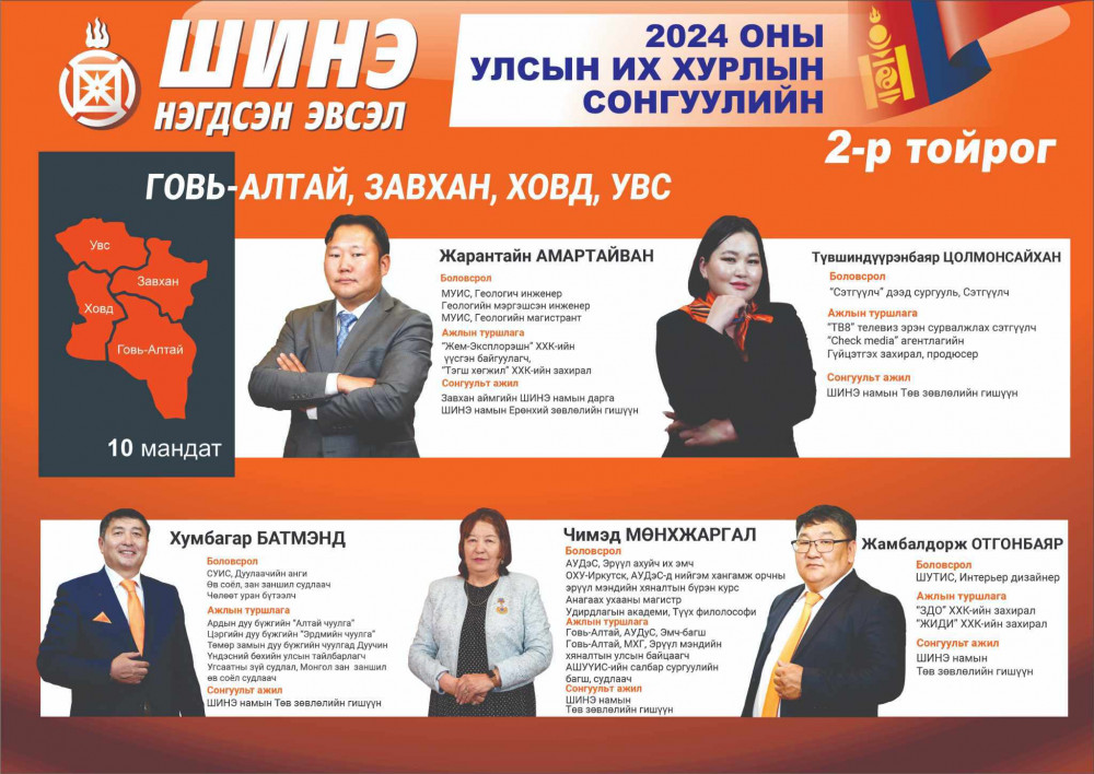 “ШИНЭ НЭГДСЭН ЭВСЭЛ”-ээс тойрогт нэр дэвшигчдийг танилцуулж байна. Тус эвслийн нийт нэр дэвшигчдийг мэргэжлээр нь авч үзвэл хуульч, эрхзүйч 20, инженер 20, багш 17, эдийн засагч 12, эмч 7 байна. Мөн малчдын төлөөлөл ч багтжээ. Түүнчлэн 12 доктор, профессор, Монгол Улсын Хөдөлмөрийн баатар 1, Монгол Улсын гавьяат цолтон 6 байх агаад нийт горилогчдын 60 гаруй хувь нь хос мэргэжил эзэмшжээ.