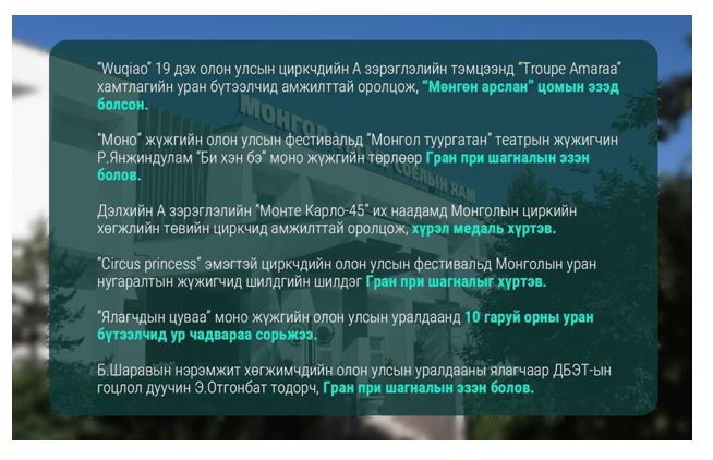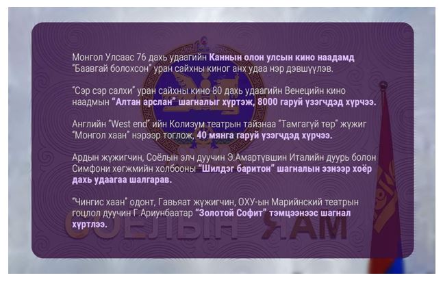 Боломжгүй мэт санагдаж байсан “Billboard”, Канн, Венецийн наадмын улаан хивсний ёслол, дэлхийн алдарт опера хаусын тайз, олон улсын фестивалиудад монгол уран бүтээлчийн дуу хоолой, уран бүтээл, аялгуу эгшиг түгэж, дэлхий дахины сонорыг мялааж байна. Урлагийнхны мөрөөдөл болсон дэлхийн тайз улам ойртож, ар араасаа амжилт дагуулж, уран бүтээлчид нэгэн дээвэр дор нэгдсэн он жилүүд байв.