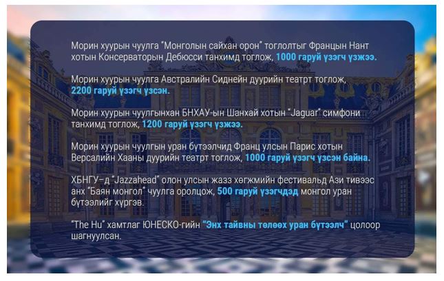 Үргэлжлүүлэн Морин хуур чуулгын уран бүтээлчид 2023 оны аравдугаар сарын 11-нд Парис хотын Версалийн ордны Хааны дуурийн театрт түүхэн тоглолтоо толилуулсан. Монгол Улсын Ерөнхийлөгч У.Хүрэлсүхийн Бүгд найрамдах Франц улсад хийсэн төрийн айлчлалын хүрээнд Парис хотын Версалийн ордны Хааны дуурийн театрт Монгол Улсын Морин хуурын чуулга “Монголын сайхан орон” тоглолтоо хийж, хүрэлцэн ирсэн хүндэт зочдыг эх орныхоо тал нутгаар “аялуулсан”. Уг хүндэтгэлийн тоглолтод Монгол Улсын Ерөнхийлөгч У.Хүрэлсүх, БНФУ-аас Монгол Улсад суугаа Онц бөгөөд бүрэн эрхт Элчин сайд Себастиан Сүрүн тэргүүтэй зочид төлөөлөгчид хүндэт зочноор оролцсон юм.
