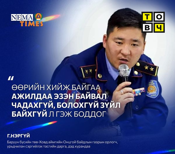 Онцгой байдлын албатай холбогдсон алба хаагч бүрийн түүх өөр, өөр. “Nematimes” булангийн өнөөдрийн танилцуулах зочин бол удам дамжсан “гал сөнөөгч”. Аавынхаа ажил, мэргэжлийг өөрийн сонирхол, зорилгоор “чимж” өдгөө дэд хурандаа хүртлээ дэвшин ажиллаж байна. Түүнийг Ганзоригийн Нэргүй гэдэг. Тэрбээр Баруун бүсийн төв-Ховд аймгийн Онцгой байдлын газрын орлогч, Урьдчилан сэргийлэх тасгийн даргын албан тушаалыг найм дахь жилдээ хашиж байна.