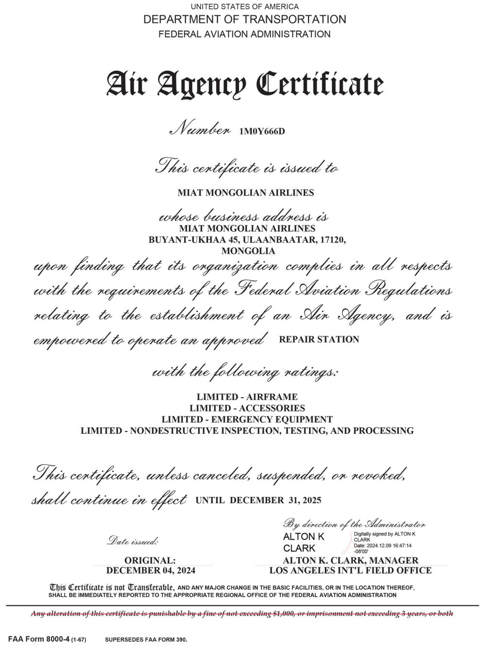 Аюулгүй ажиллагааг эрхэмлэн ажиллаж, АНУ-д хүлээн зөвшөөрөгдсөн байгууллага болохоо баталсан Агаарын хөлгийн засвар үйлчилгээний газрын инженер, техникийн ажилтнууддаа халуун баяр хүргэе.