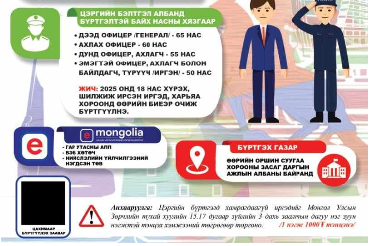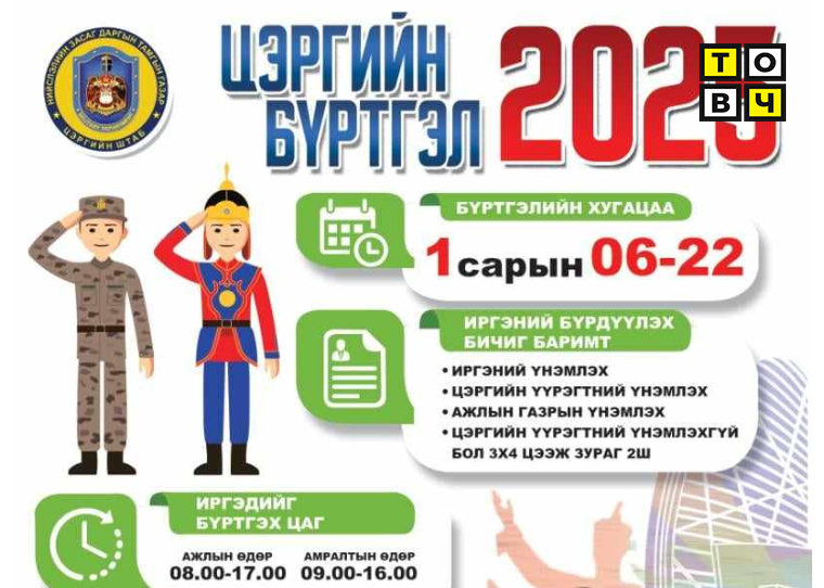 Цэргийн албаны тухай хууль, Батлан хамгаалахын сайдын тушаал, нийслэлийн Засаг даргын захирамжаар 2025 оны цэргийн бүртгэлийг нийслэлийн хэмжээнд нэгдүгээр сарын 6-22-ны өдрүүдэд зохион байгуулна. Монгол Улсын иргэн 18-50 насны цэргийн үүрэгтнүүд, 65 хүртэлх насны бэлтгэл офицерууд, цэргийн бүртгэлтэй мэргэжил эзэмшсэн эмэгтэйчүүд жилд нэг удаа бүртгэлд хамрагдах үүрэгтэй билээ.
